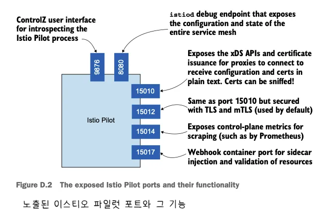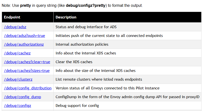 istioctl x internal-debug 명령어가 동일한 엔드포인트를 노출한다.파일럿은 서비스 메시를 검사하고 디버깅하기 위한 정보들도 노출한다.