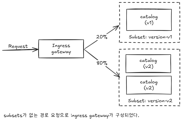 DestinationRule 리소스가 없으면 인그레스 게이트웨이는 부분집합 version-v1과 version-v2에 대한 클러스터 정의가 없으므로, 모든 요청은 실패할 것이다.