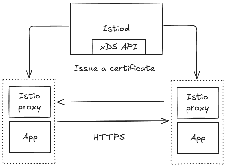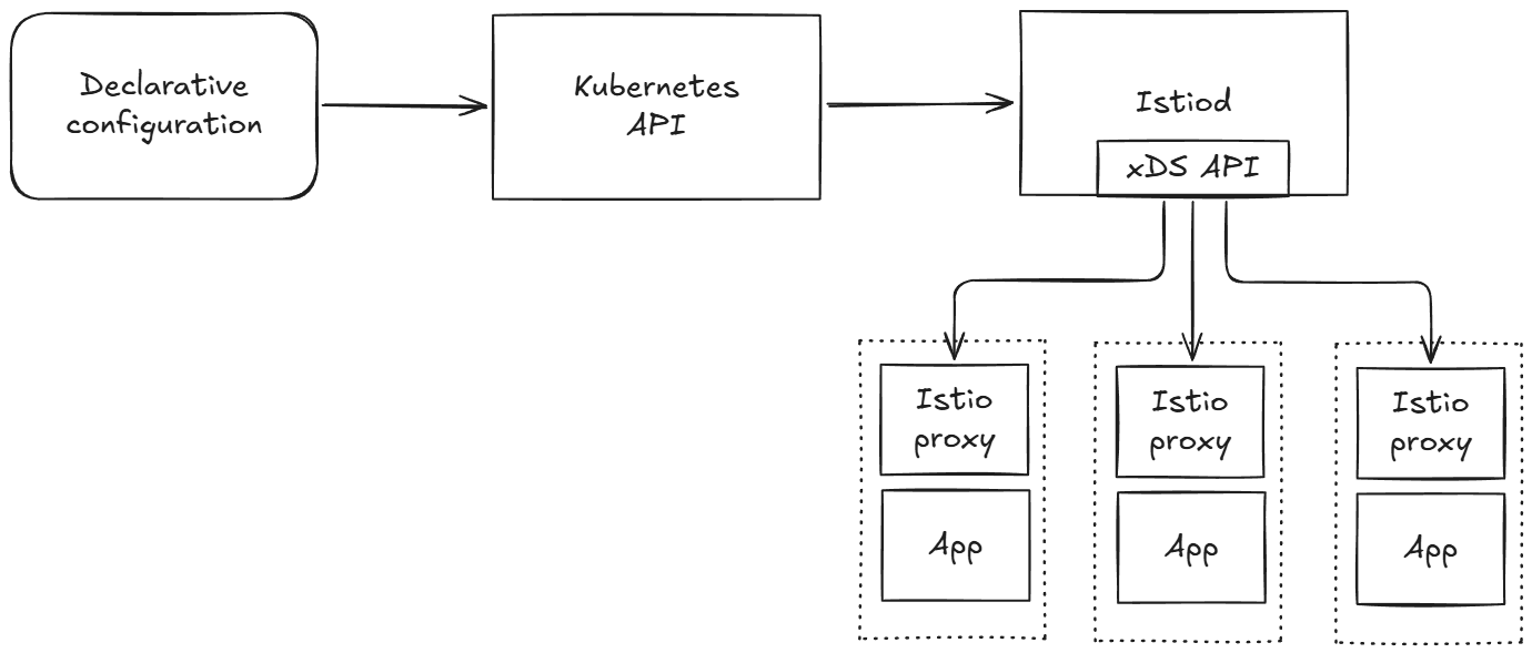 아래 그림은 Istiod가 Kubernetes API를 사용해 VirtualService 등의 Istio 설정을 읽고 Proxy를 동적으로 설정하는 모습이다.