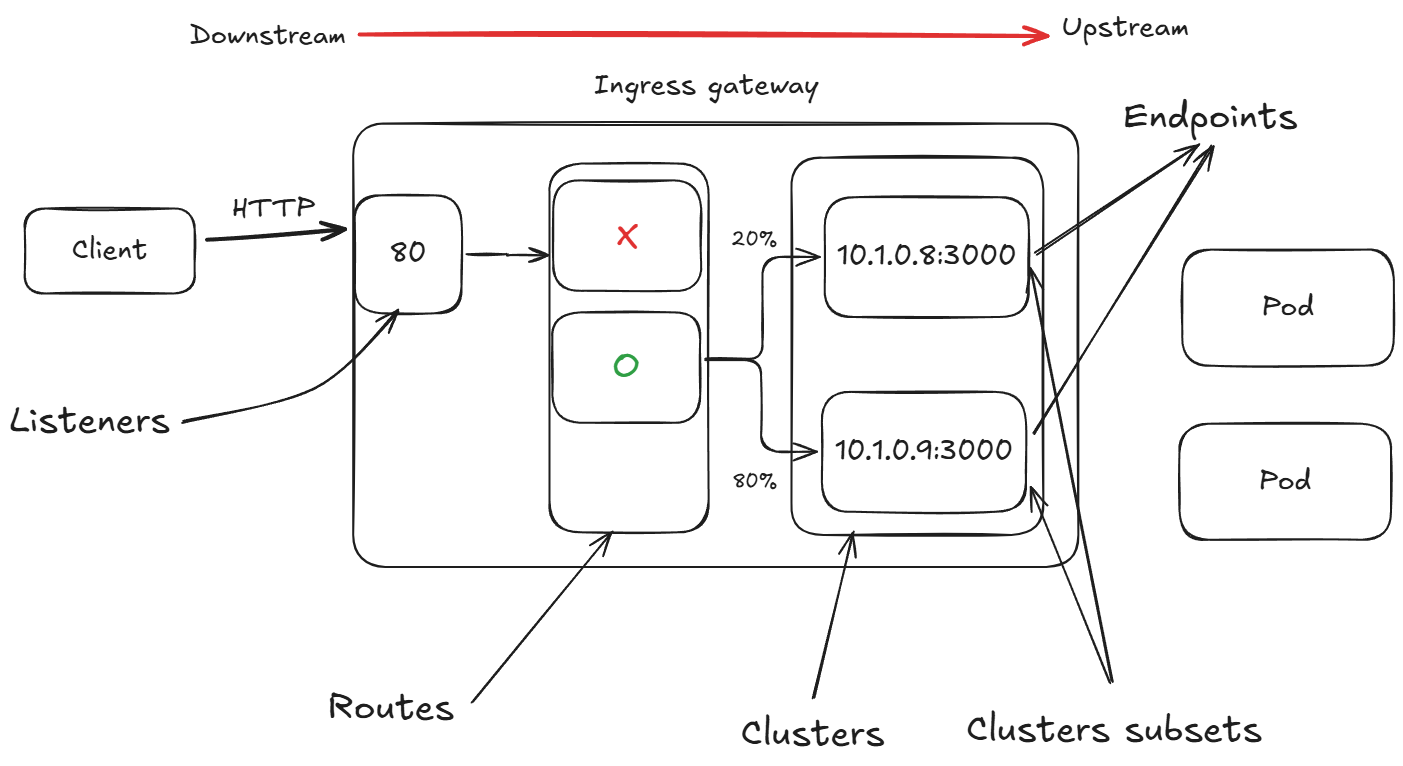트래픽은 Downstream에서 Listener로 들어오며, Cluster 중 하나로 Routing, Cluster는 Upstream으로 보내는 역할이다.