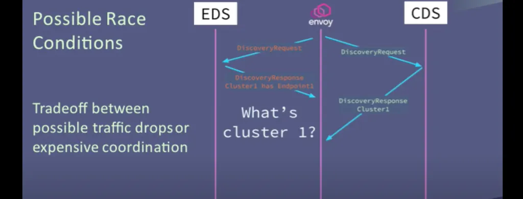트래픽을 클러스터 foo로 라우팅하는 새 루트가 RDS로 업데이트됐는데, 이 클러스터 foo를 포함한 CDS 업데이트는 아직 수행되지 않았을 수 있다. 이 경우 CDS가 업데이트될 때까지 라우팅 오류가 발생할 수 있다.