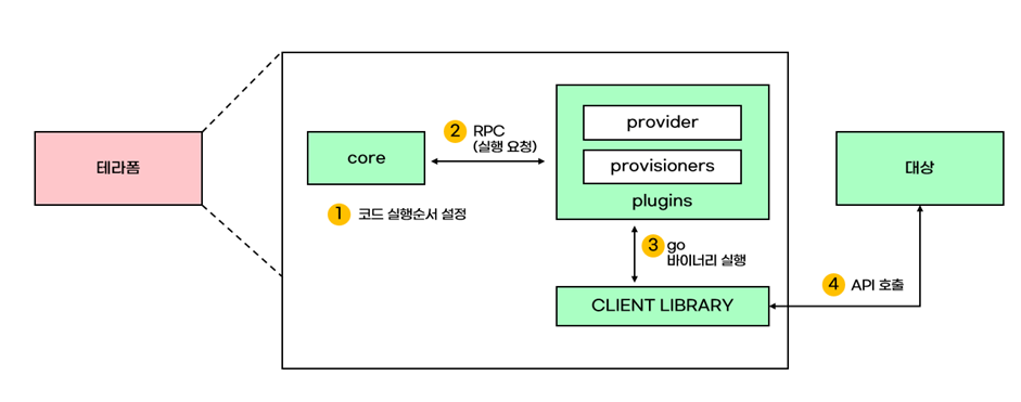 테라폼은 terraform 바이너리 파일을 시작으로 로컬 환경에나 배포 서버와 같은 원격 환경에서 원하는 대상을 호출하는 방식으로 실행된다. 이때 ‘원하는 대상’은 호출하는 방식이 서로 다르지만 대상의 공급자, 즉 프로바이더가 제공하는 API를 호출해 상호작용을 한다. 여기서 테라폼이 대상과의 상호작용을 할 수 있도록 하는 것이 ‘프로바이더’다.