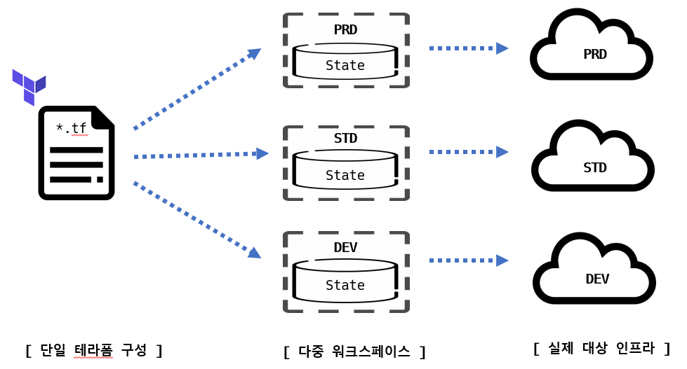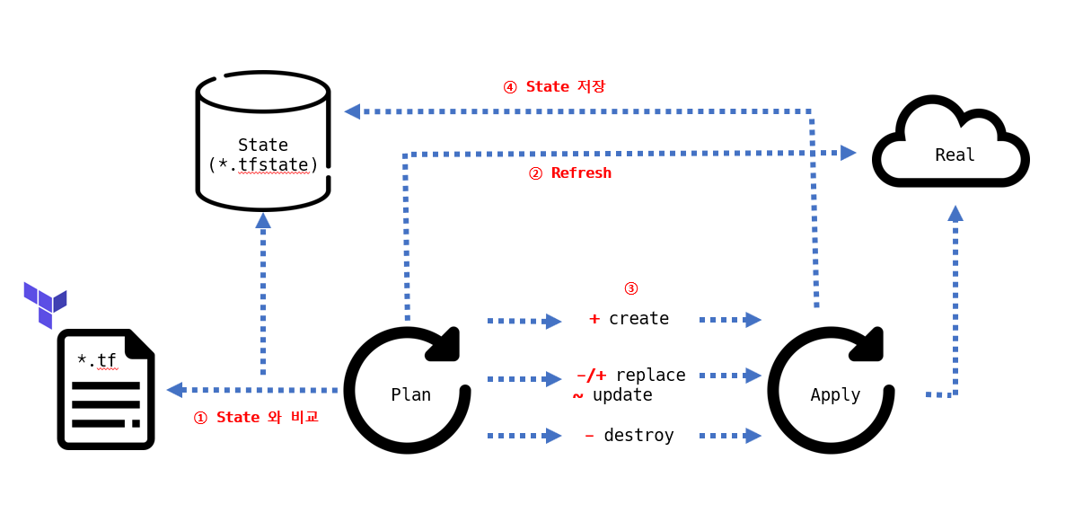 | 유형 | 구성 리소스 정의 | State 구성 데이터 | 실제 리소스 | 기본 예상 동작 |