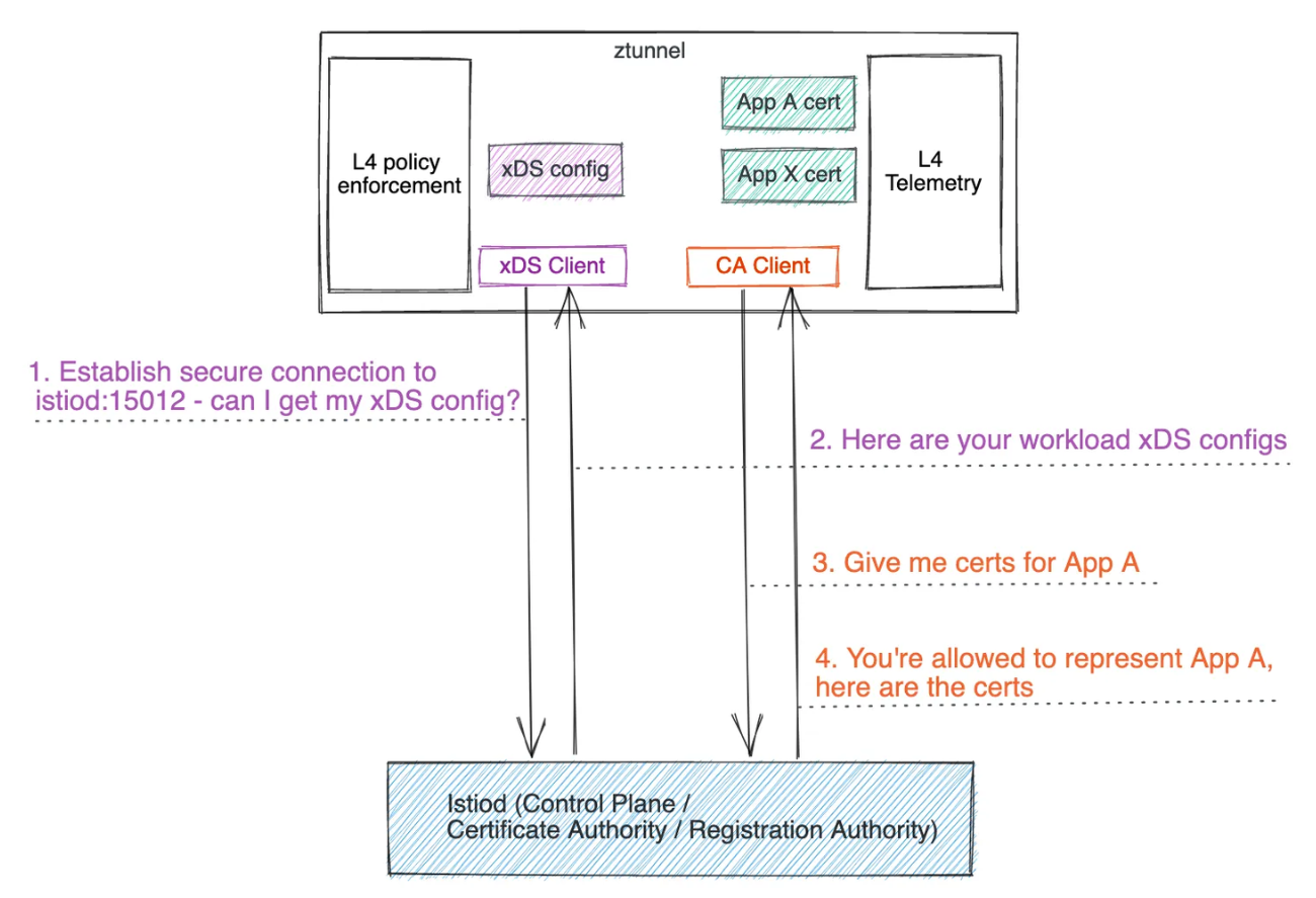 사이드카와 유사하게 ztunnel은 xDS 클라이언트 및 CA 클라이언트 역할도 수행