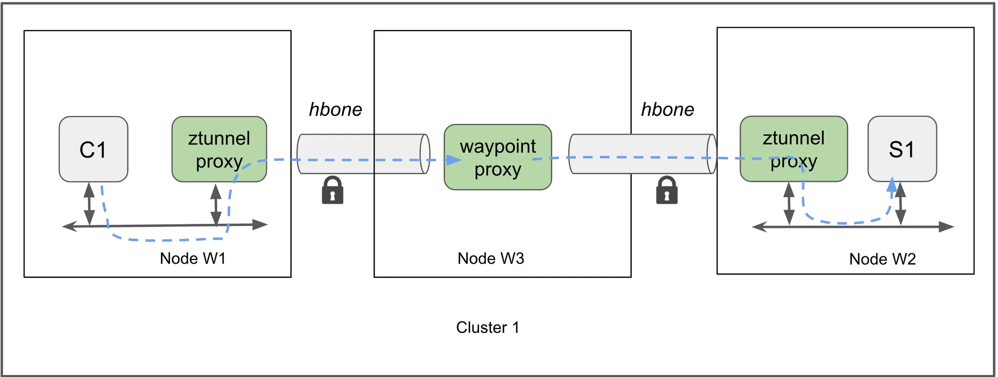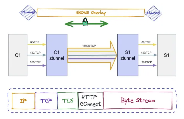 - HBONE HTTP Based Overlay Network Encapsulation는 애플리케이션 통신 트래픽을 HTTP CONNECT 메서드를 통해 표준 HTTP 터널링을 사용합니다. TCP 상위에 HTTP/2를 사용하며, TLS를 통해 상호 인증과 암호를 제공합니다. HBONE tunnel 은 TCP 15008 포트를 사용합니다 - HTTP CONNECT & HTTP/2