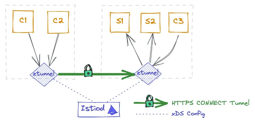- 이는 사이드카, 게이트웨이 또는 웨이포인트 프록시와 유사하게 작동하지만, Istiod가 ztunnel의 요청을 인식하고 ztunnel용으로 특별히 제작된 xDS 구성을 전송한다는 점이 다릅니다. 이 구성에 대해서는 곧 자세히 알아보겠습니다.