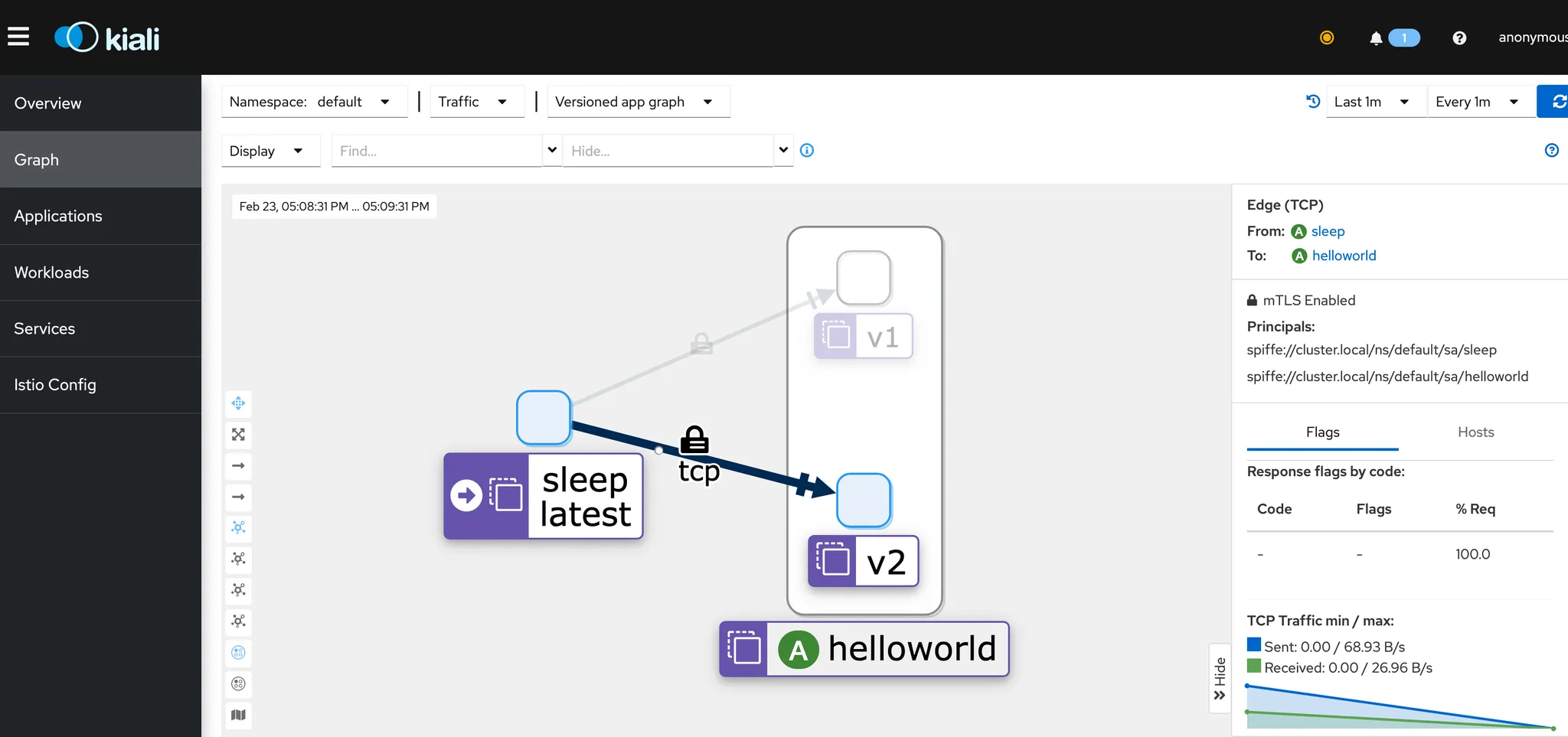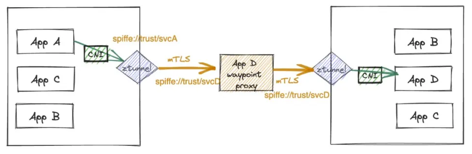 - 포드가 앰비언트 메시에 성공적으로 추가되면, 메시의 포드 간 트래픽은 Istio와 마찬가지로 기본적으로 mTLS로 완전히 암호화됩니다.