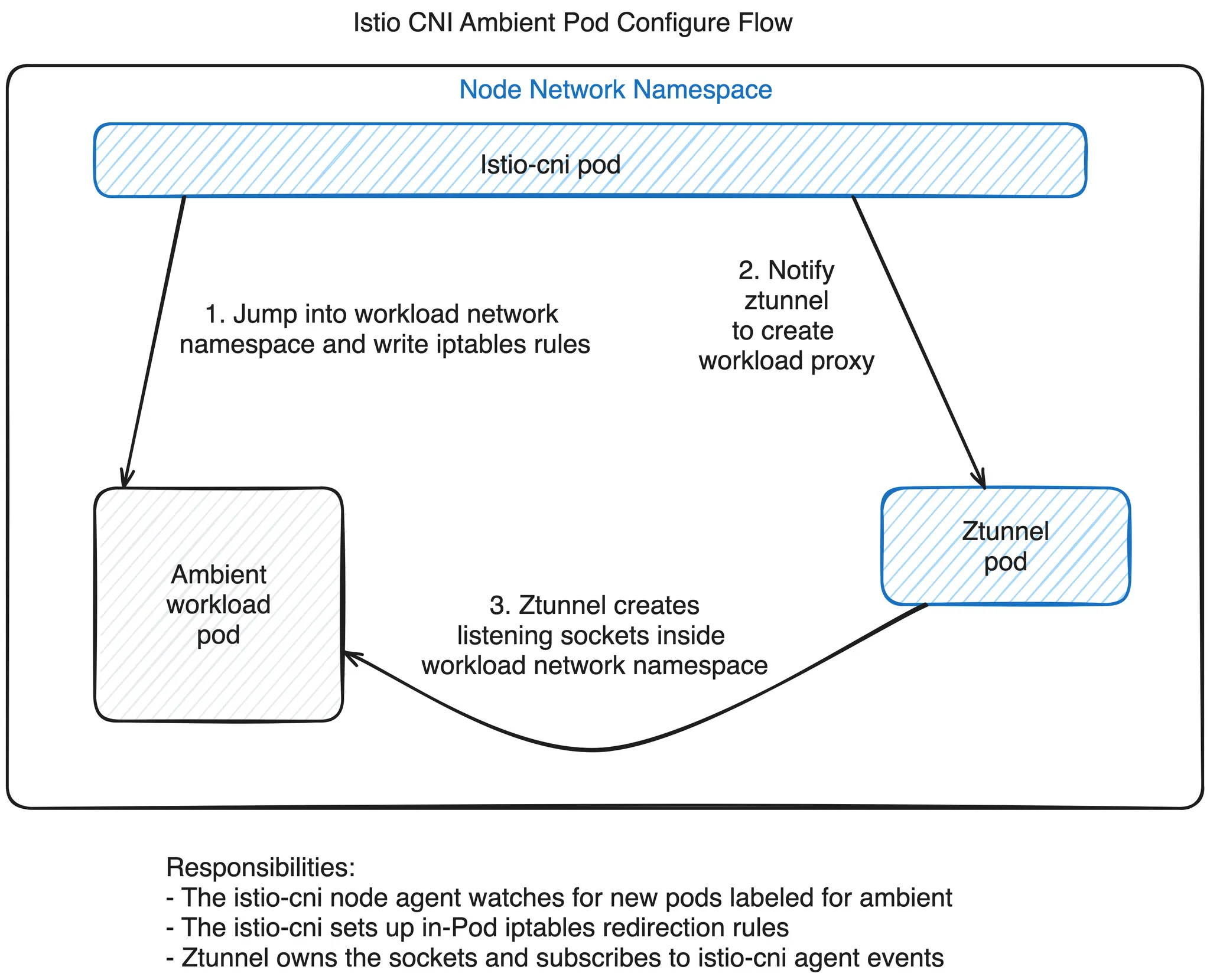 - istio-cni 노드 에이전트는 포드의 네트워크 네임스페이스에 들어가 포드 네트워크 네임스페이스 내부에 네트워크 리디렉션 규칙을 설정하여 포드에 들어오고 나가는 패킷을 가로채서 잘 알려진 포트(15008, 15006, 15001)에서 노드 로컬 ztunnel 프록시 인스턴스로 투명하게 리디렉션합니다. 그런 다음 istio-cni 노드 에이전트는 유닉스 도메인 소켓을 통해 노드 ztunnel에 포드의 네트워크 네임스페이스(15008, 15006, 15001) 내부에 로컬 프록시 리스닝 포트를 설정해야 한다고 알리고, ztunnel에 포드의 네트워크 네임스페이스를 나타내는 저수준 리눅스 파일 설명자를 제공합니다.