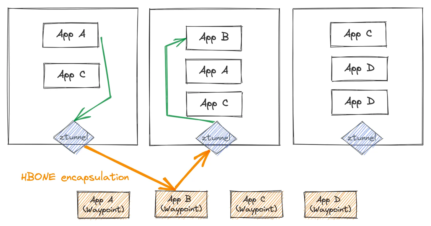 Istio의 제어 평면은 클러스터의 ztunnel을 구성하여 L7 처리가 필요한 모든 트래픽을 웨이포인트 프록시를 통해 전달합니다.