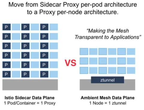 Sidecar (Proxy 모든 기능 담당) vs Ambient Mesh (L4 Proxy 와 L7 Proxy 기능 분리)