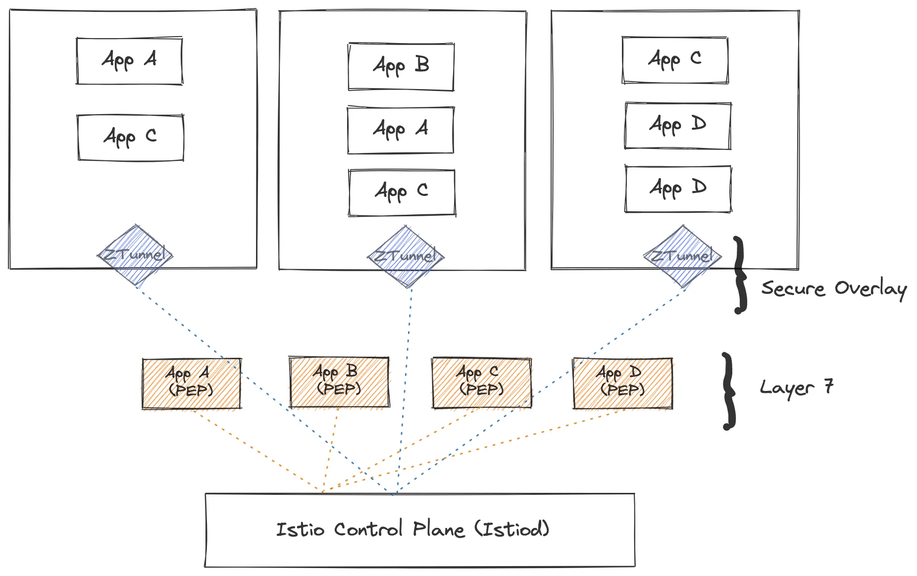 - 새 모델에서 주변 메시의 포드 간 암호화된 트래픽이 어떻게 흐르는지 설명하는 다이어그램