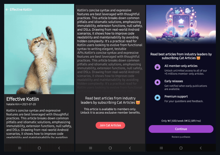 이번 포스트에서는 Jetpack Compose와 RevenueCat SDK를 사용하여 Android에서 인앱 구독 및 페이월 기능을 원활하게 구현하는 방법을 알아보고, 오픈소스 프로젝트인 Cat Paywall Compose를 살펴보겠습니다.
