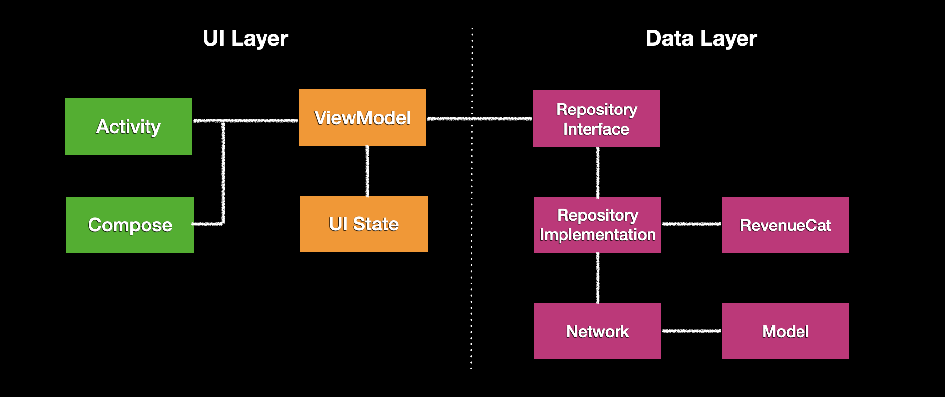 Cat Paywall Compose는 Google의 공식 아키텍처 가이드라인을 준수하여 중소 규모 프로젝트에 적합한 아키텍처 디자인을 제공합니다. 아키텍처는 아래 그림과 같이 UI 레이어와 데이터 레이어, 두 가지 주요 레이어로 구성됩니다