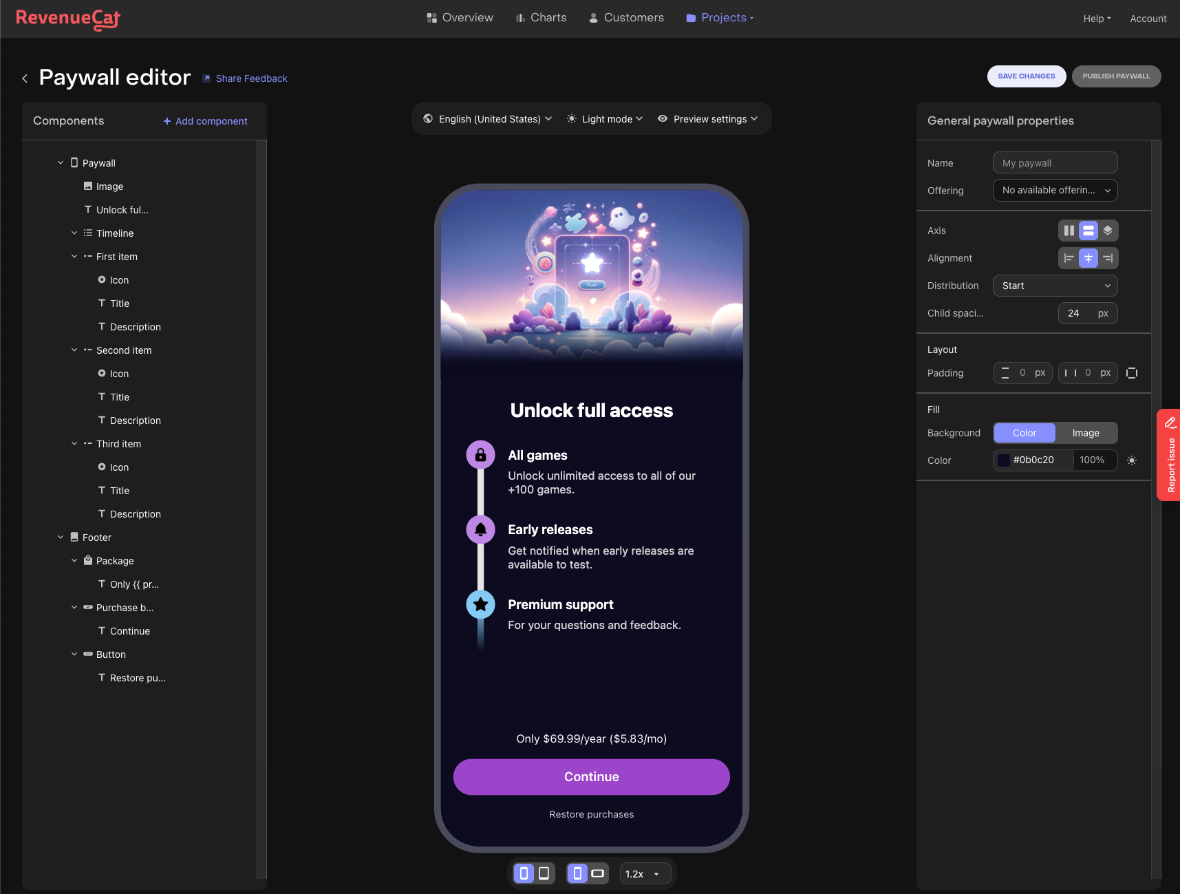 Paywalls v2에 도입된 Paywall Editor는 Figma와 유사한 인터페이스를 제공하여 전체 Paywall UI를 디자인하고 맞춤 설정할 수 있습니다. 변경 사항을 적용한 후 "Save Changes"을 클릭하고 "Publish Paywall"를 클릭하면 업데이트된 디자인이 서버 기반 UI (server driven UI) 시스템을 통해 모든 사용자 (Android 및 iOS)가 앱을 플레이 스토어에서 업데이트 하지 않아도 자동으로 업데이트됩니다.