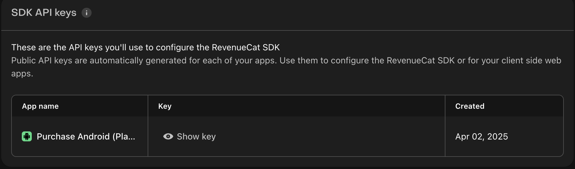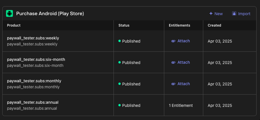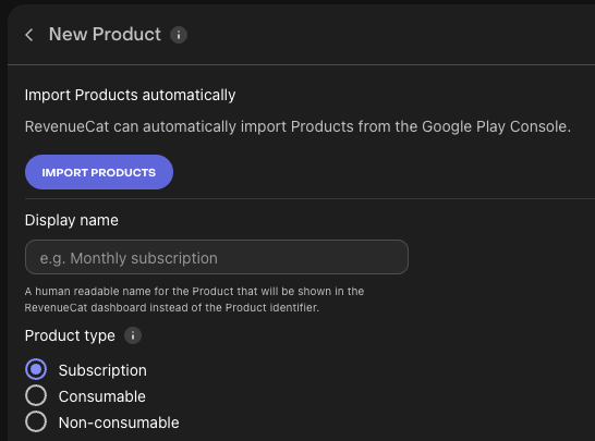 이제 Google Play 애플리케이션이 RevenueCat에 연결되어 Google Play에서 생성한 인앱 상품과 구독을 자동으로 가져올 수 있습니다.