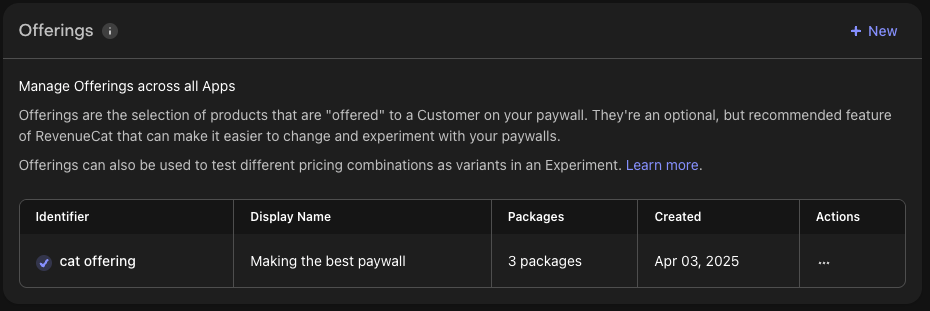 이제 대부분의 기본적인 설정이 완료되었습니다. 이제 첫 번째 오퍼링을 생성할 차례입니다. 오퍼링은 페이월에서 사용자에게 표시되는 제품의 정보를 나타냅니다. (가령, 한 달에 2천원으로 유료 구독을 할지, 1년에 1만 5천원으로 유로 구독을 할지) 오퍼링 생성 가이드의 단계에 따라 새 오퍼링을 생성할 수 있습니다. 생성이 완료되면 아래와 같이 결과가 반영됩니다.
