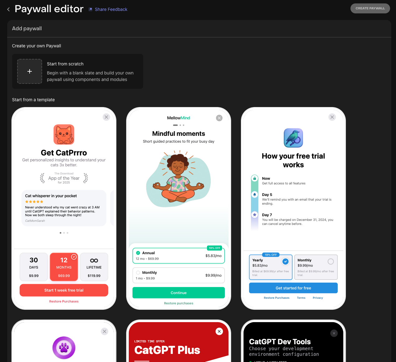 RevenueCat은 제품을 빠르게 구성하실 수 있도록 몇 가지 템플릿을 제공합니다. 따라서 처음부터 직접 페이월 화면을 구성하시거나, 제공되는 템플릿 중에서 선택할 수 있습니다. 템플릿을 선택하면 바로 페이월 편집기 화면으로 이동합니다.