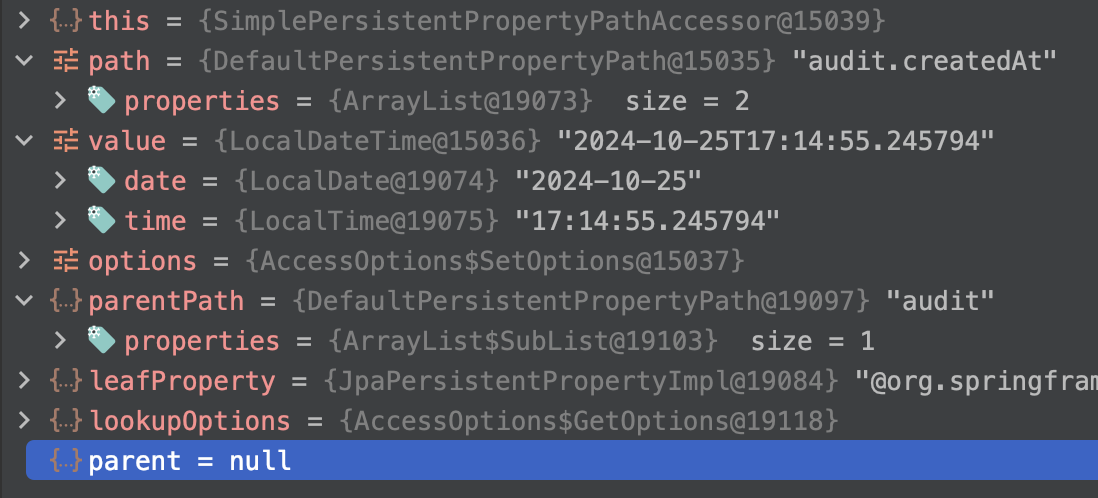 아래의 코드는 그 과정 중에서 현재 시간(파라미터의 value)을 auditing 컬럼에 설정하는 부분입니다. auditing 속성은 PersistentPropertyPath 값으로 전달됩니다.