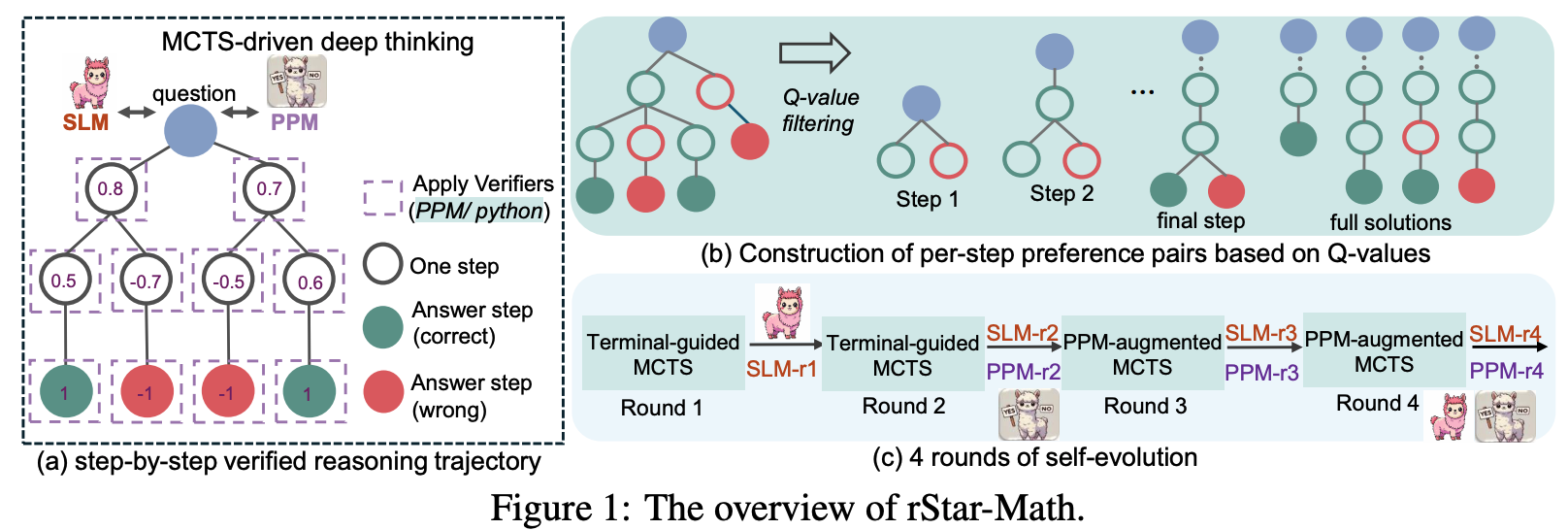 rStar-Math๋ ์์ ์ธ์ด ๋ชจ๋ธ(SLM)์ด ๋ชฌํ ์นด๋ฅผ๋ก ํธ๋ฆฌ ํ์(MCTS)์ ํตํ "๊น์ ์ฌ๊ณ "๋ฅผ ํ์ฉํ์ฌ OpenAI o1๊ณผ ๊ฒฌ์ค๋งํ ์ํ ์ถ๋ก ๋ฅ๋ ฅ์ ๋ฌ์ฑํ ์ ์์์ ๋ณด์ฌ์ฃผ๋ ์ฐ๊ตฌ์ ๋๋ค. ์ธ ๊ฐ์ง ํ์ ์ ์ธ ๋ฐฉ๋ฒ์ ๋์ ํ๋๋ฐ, 1) ์ฝ๋ ์ฆ๊ฐ๋ CoT ๋ฐ์ดํฐ ํฉ์ฑ ๋ฐฉ๋ฒ์ผ๋ก ๊ฒ์ฆ๋ ๋จ๊ณ๋ณ ์ถ๋ก ๊ฒฝ๋ก๋ฅผ ์์ฑํ๊ณ , 2) ๋จ์ํ ๋จ๊ณ๋ณ ์ ์ ์ฃผ์์ ํผํ๋ ์๋ก์ด ๊ณผ์ ๋ณด์ ๋ชจ๋ธ ํ์ต ๋ฐฉ๋ฒ์ ๊ฐ๋ฐํ๋ฉฐ, 3) ์ ์ฑ SLM๊ณผ ๊ณผ์ ์ ํธ๋ ๋ชจ๋ธ์ ์ฒ์๋ถํฐ ๊ตฌ์ถํ์ฌ ๋ฐ๋ณต์ ์ผ๋ก ์งํ์ํค๋ ์๊ฐ ์งํ ๋ฐฉ์์ ์ ์ฉํ์ต๋๋ค. 74.7๋ง ๊ฐ์ ์ํ ๋ฌธ์ ์ ๋ํ ์๋ฐฑ๋ง ๊ฐ์ ํฉ์ฑ ํด๋ฒ์ ํตํด 4๋ผ์ด๋์ ์๊ฐ ์งํ๋ฅผ ๊ฑฐ์น ๊ฒฐ๊ณผ, MATH ๋ฒค์น๋งํฌ์ ๋ฏธ๊ตญ ์ํ ์ฌ๋ฆผํผ์๋(AIME)์์ ์ต๊ณ ์์ค์ ์ฑ๋ฅ์ ๋ฌ์ฑํ์ต๋๋ค.