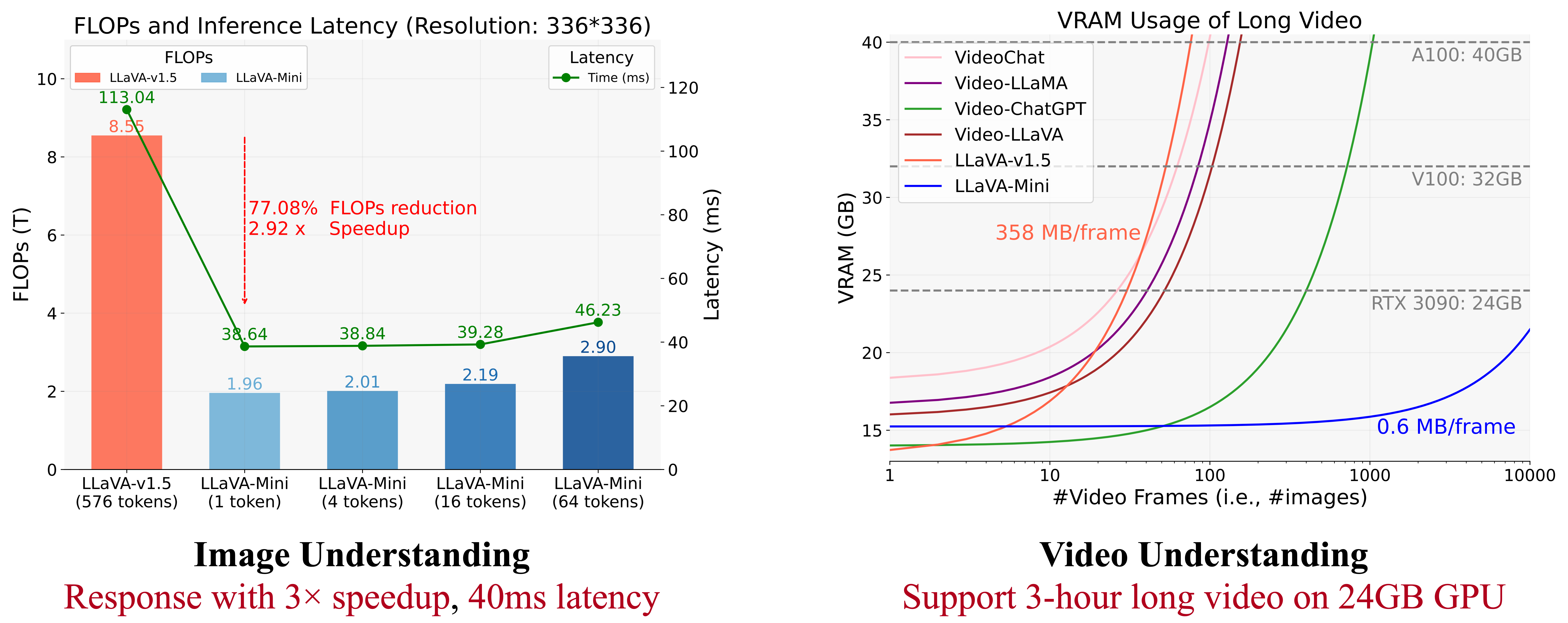 LLaVA-Mini๋ ์๊ฐ ํ ํฐ์ ์ต์ํํ์ฌ ๋๊ท๋ชจ ๋ค์ค ๋ชจ๋ฌ ๋ชจ๋ธ(LMM)์ ํจ์จ์ฑ์ ํฌ๊ฒ ํฅ์์ํจ ์๋ก์ด ํ๋ ์์ํฌ์ ๋๋ค. ์ฐ๊ตฌ์ง์ LMM์ด ์๊ฐ ํ ํฐ์ ์ด๋ป๊ฒ ์ดํดํ๋์ง ๋ถ์ํ ๊ฒฐ๊ณผ, ๋๋ถ๋ถ์ ์๊ฐ ํ ํฐ์ด LLM ๋ฐฑ๋ณธ์ ์ด๊ธฐ ์ธต์์๋ง ์ค์ํ ์ญํ ์ ํ๋ค๋ ๊ฒ์ ๋ฐ๊ฒฌํ์ต๋๋ค. ์ด๋ฅผ ๋ฐํ์ผ๋ก ๋ชจ๋ฌ๋ฆฌํฐ ์ฌ์ ์ตํฉ(modality pre-fusion)์ ๋์ ํ์ฌ ์๊ฐ ์ ๋ณด๋ฅผ ํ ์คํธ ํ ํฐ์ ๋ฏธ๋ฆฌ ์ตํฉํจ์ผ๋ก์จ, LLM ๋ฐฑ๋ณธ์ ๊ณต๊ธ๋๋ ์๊ฐ ํ ํฐ์ ๋จ ํ๋๋ก ์์ถํ ์ ์๊ฒ ํ์ต๋๋ค. ์คํ ๊ฒฐ๊ณผ, ๊ธฐ์กด LLaVA-v1.5๊ฐ 576๊ฐ์ ์๊ฐ ํ ํฐ์ ์ฌ์ฉํ ๊ฒ๊ณผ ๋ฌ๋ฆฌ ๋จ 1๊ฐ์ ํ ํฐ์ผ๋ก๋ ๋ ๋์ ์ฑ๋ฅ์ ๋ณด์ฌ์ฃผ์์ผ๋ฉฐ, ์ฐ์ฐ๋์ 77% ์ค์ด๊ณ 40๋ฐ๋ฆฌ์ด ๋ด์ ๋น ๋ฅธ ์๋ต ์๊ฐ์ ๋ฌ์ฑํ์ต๋๋ค.
