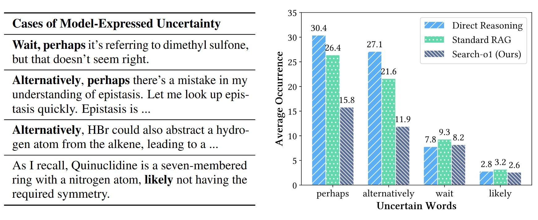 Search-o1์ ๋๊ท๋ชจ ์ถ๋ก ๋ชจ๋ธ(LRM)์ ์ง์ ๋ถ์กฑ ๋ฌธ์ ๋ฅผ ํด๊ฒฐํ๊ธฐ ์ํ ์๋ก์ด ํ๋ ์์ํฌ์ ๋๋ค. ๋ชจ๋ธ์ด ๋ถํ์คํ ์ง์์ ์ง๋ฉดํ์ ๋ ๋์ ์ผ๋ก ์ธ๋ถ ์ง์์ ๊ฒ์ํ ์ ์๋ ์์ด์ ํธ ๊ธฐ๋ฐ ๊ฒ์-์ฆ๊ฐ ์์ฑ(RAG) ๋ฉ์ปค๋์ฆ์ ๋์ ํ๊ณ , ๊ฒ์๋ ๋ฌธ์๋ฅผ ์ ์ ํ๋ Reason-in-Documents ๋ชจ๋์ ํตํด ์ถ๋ก ๊ณผ์ ์ ๋ ธ์ด์ฆ๋ฅผ ์ต์ํํ๋ฉด์ ํ์ํ ์ ๋ณด๋ฅผ ํตํฉํฉ๋๋ค. ๊ณผํ, ์ํ, ์ฝ๋ฉ ๋ฑ์ ๋ณต์กํ ์ถ๋ก ์์ ๊ณผ 6๊ฐ์ ์คํ ๋๋ฉ์ธ QA ๋ฒค์น๋งํฌ์์ ์ค์ํ ๊ด๋ฒ์ํ ์คํ์ ํตํด ์ฐ์ํ ์ฑ๋ฅ์ ์ ์ฆํ์ผ๋ฉฐ, ์ด๋ ๋ณต์กํ ์ถ๋ก ์์ ์์ LRM์ ์ ๋ขฐ์ฑ๊ณผ ์ ์ฉ ๊ฐ๋ฅ์ฑ์ ํฌ๊ฒ ํฅ์์์ผฐ์ต๋๋ค.