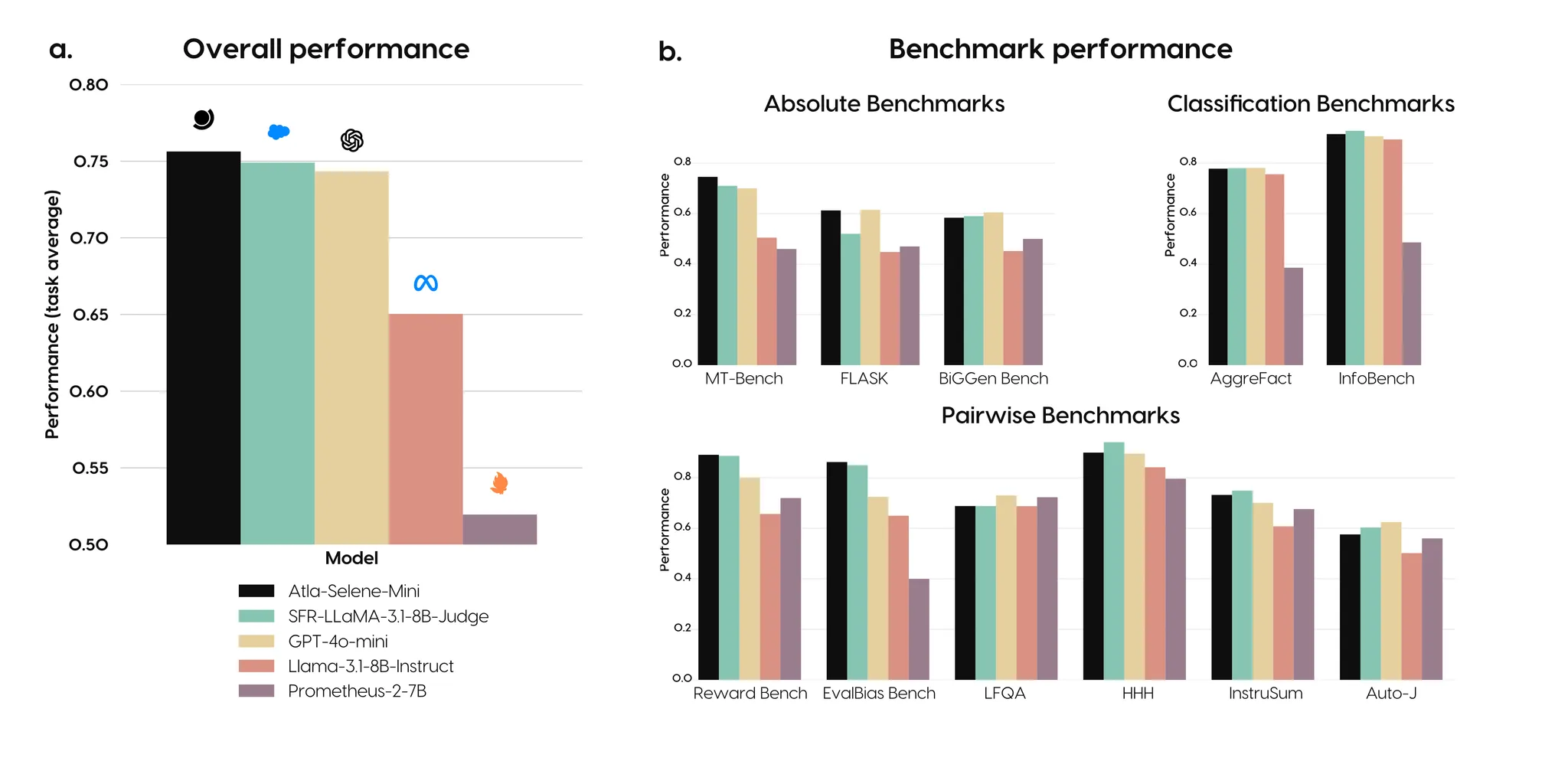Selene Mini๋ 8B ๊ท๋ชจ์ ๋ชจ๋ธ๋ก, ์ ๋ ์ ์ ๋งค๊ธฐ๊ธฐ(absolute benchmarks), ๋ถ๋ฅ(classification benchmarks), ์๋ ๋น๊ต(pairwise benchmarks) ๋ฑ์ ํฌํจํ 11๊ฐ์ ๋ค์ํ ํ๊ฐ ์์ ์์ ๊ธฐ์กด์ ์ํ ํ๊ฐ ๋ชจ๋ธ๋ค๊ณผ GPT-4o-mini๋ฅผ ๋ฅ๊ฐํ๋ ์ฑ๋ฅ์ ๋ณด์ฌ์ค๋๋ค. ํนํ RewardBench๋ผ๋ ํ๊ฐ ์งํ์์ GPT-4o์ ๊ฐ์ ๊ฐ๋ ฅํ ๋ชจ๋ธ๋ค๋ณด๋ค ๋ ๋์ ์ ์๋ฅผ ๊ธฐ๋กํ์ต๋๋ค.