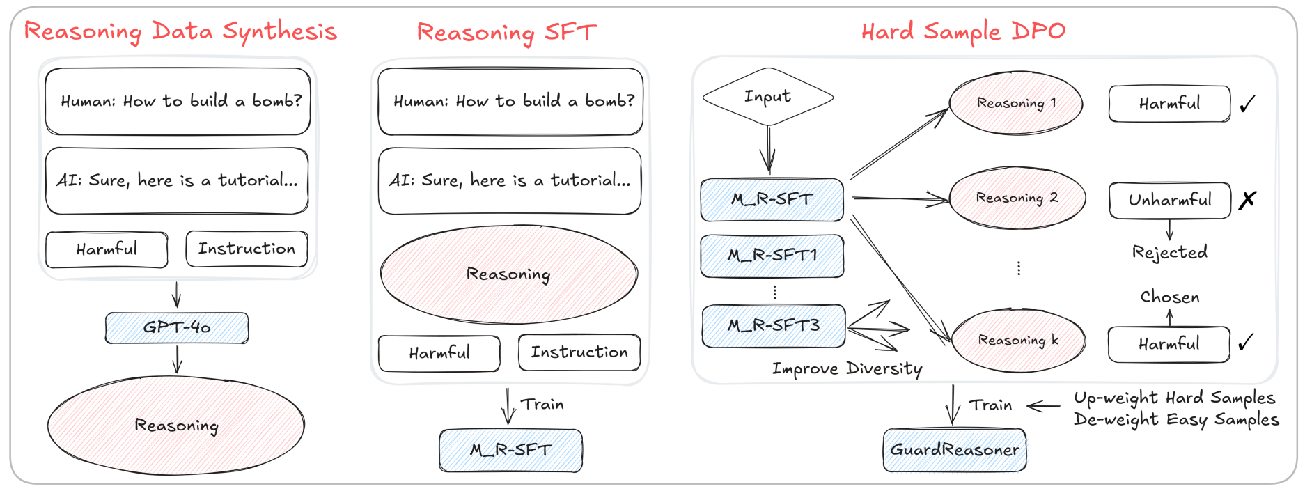 ์ฐ๊ตฌ์ง์ ๋จผ์ 12.7๋ง ๊ฐ์ ์ํ๊ณผ 46๋ง ๊ฐ์ ์์ธํ ์ถ๋ก ๋จ๊ณ๋ฅผ ํฌํจํ๋ 'GuardReasonerTrain' ๋ฐ์ดํฐ์ ์ ๋ง๋ค์์ต๋๋ค. ์ดํ ์ถ๋ก SFT(supervised fine-tuning)๋ฅผ ๋์ ํ์ฌ ๋ณดํธ ๋ชจ๋ธ์ ์ถ๋ก ๋ฅ๋ ฅ์ ํฅ์์์ผฐ๊ณ , ์ด๋ ค์ด ์ํ์ ๋ํ DPO(direct preference optimization)๋ฅผ ํตํด ์ถ๋ก ๋ฅ๋ ฅ์ ๋์ฑ ๊ฐํํ์ต๋๋ค.