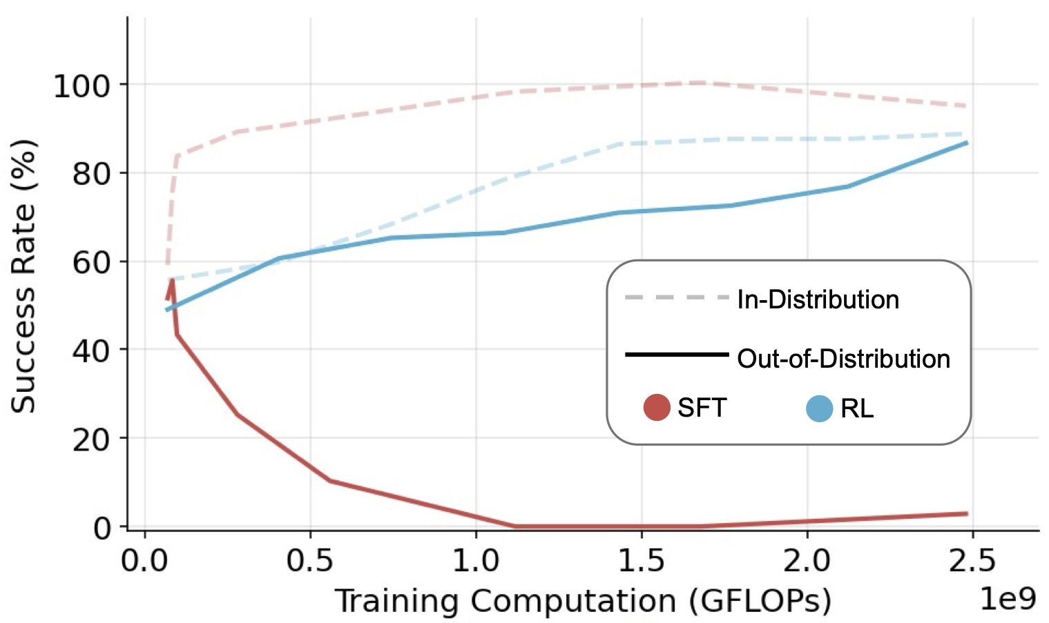 ์ฐ๊ตฌ ๊ฒฐ๊ณผ, ํนํ ๊ฒฐ๊ณผ ๊ธฐ๋ฐ ๋ณด์์ ์ฌ์ฉํ RL์ ๊ท์น ๊ธฐ๋ฐ ํ ์คํธ์ ์๊ฐ์ ๋ณํ ๋ชจ๋์์ ์ฐ์ํ ์ผ๋ฐํ ๋ฅ๋ ฅ์ ๋ณด์ฌ์ฃผ์์ต๋๋ค. ๋ฐ๋ฉด SFT๋ ํ์ต ๋ฐ์ดํฐ๋ฅผ ๋จ์ ์๊ธฐํ๋ ๊ฒฝํฅ์ด ์์ด, ํ์ตํ์ง ์์ ์๋ก์ด ์ํฉ์์๋ ์ด๋ ค์์ ๊ฒช์์ต๋๋ค. ๋ ๊น์ ๋ถ์ ๊ฒฐ๊ณผ, RL์ ๋ชจ๋ธ์ ๊ธฐ๋ณธ์ ์ธ ์๊ฐ ์ธ์ ๋ฅ๋ ฅ๋ ํฅ์์ํค๋ ๊ฒ์ผ๋ก ๋ํ๋ฌ์ต๋๋ค.