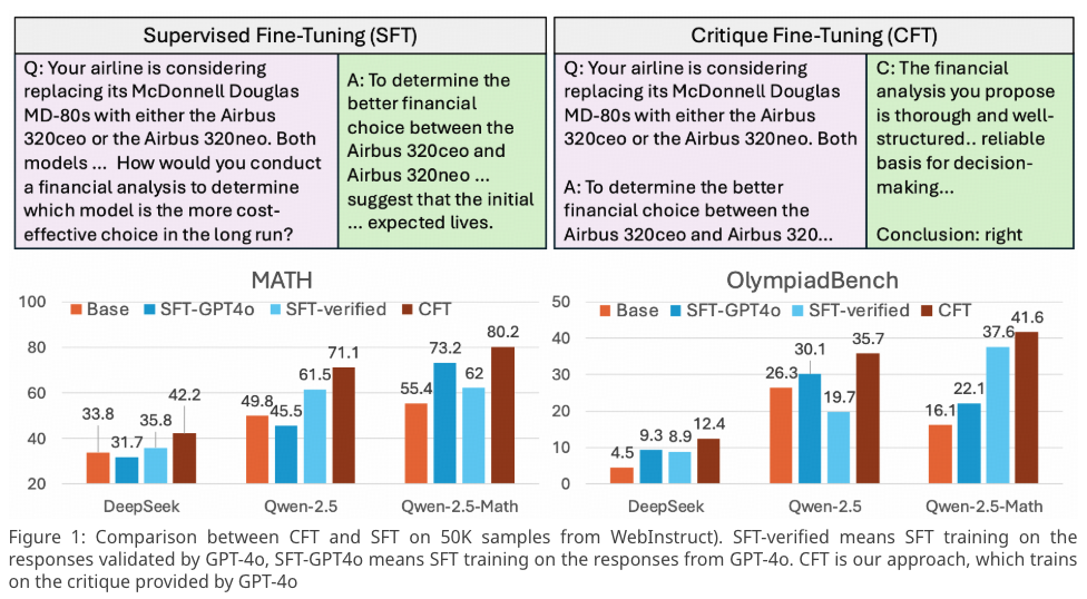 ์ ํต์ ์ธ SFT ๋ฐฉ์์ ๋ชจ๋ธ์ด '์ ๋ต'์ ๋จ์ํ ๋ชจ๋ฐฉํ๋๋ก ํ๋ จํ๋ ๋ฐ๋ฉด, CFT๋ '๋ถ์ ํํ ๋ต๋ณ'์ ๋นํํ๊ณ ๋ถ์ํ๋ ๋ฐฉ์์ผ๋ก ํ์ต์ ์งํํฉ๋๋ค. ์ด๋ ๋ง์น ์ธ๊ฐ์ด ๋นํ์ ์ฌ๊ณ ๋ฅผ ํตํด ํ์ตํ๋ ๊ณผ์ ์ ๋ชจ๋ฐฉํ ๊ฒ์ ๋๋ค.
