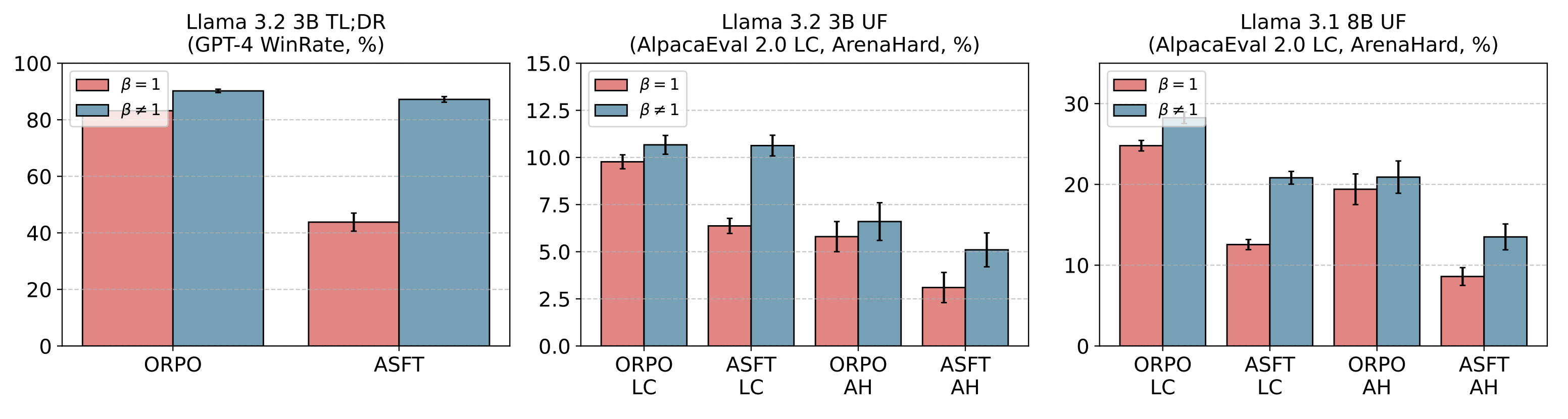 ์ฐ๊ตฌ ๊ฒฐ๊ณผ, 1๋จ๊ณ ๋ฐฉ์์ด 2๋จ๊ณ ๋ฐฉ์๋ณด๋ค ์ฑ๋ฅ์ด ๋จ์ด์ง๋ค๋ ์ฌ์ค์ ๋ฐ๊ฒฌํ์ต๋๋ค. ์ด๋ฅผ ๊ฐ์ ํ๊ธฐ ์ํด ์ฐ๊ตฌ์ง์ 'beta ํ๋ผ๋ฏธํฐ'๋ผ๋ ์๋ก์ด ์์๋ฅผ ๋์ ํ๊ณ , ์ด๋ฅผ ํตํด 1๋จ๊ณ ๋ฐฉ์์ ์ฑ๋ฅ์ ํฌ๊ฒ ํฅ์์ํฌ ์ ์์์ต๋๋ค. ํนํ ORPO์ ASFT๋ผ๋ ๋ฐฉ์์์ ๊ฐ๊ฐ 3.46์ ๊ณผ 8.27์ ์ ์ฑ๋ฅ ํฅ์์ ์ด๋์ด๋์ต๋๋ค.