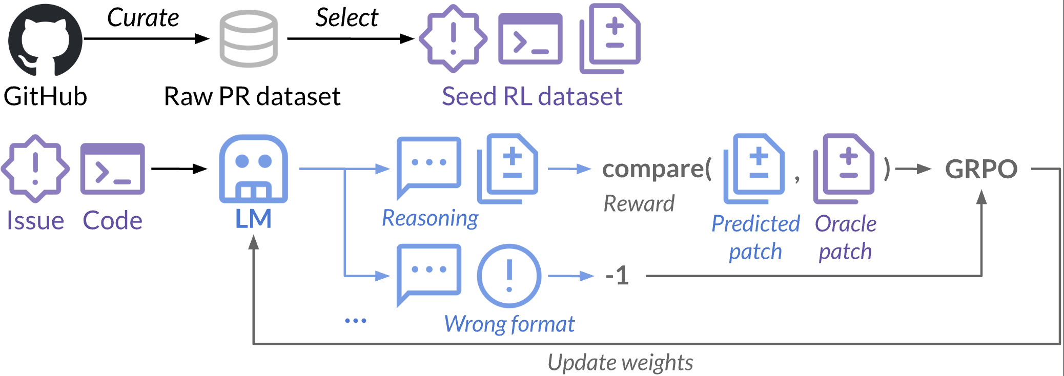 ๋ณธ ๋ ผ๋ฌธ์ ์ค์ ์ํํธ์จ์ด ์์ง๋์ด๋ง์ ํ๋ถํ ๋ฐ์ดํฐ๋ฅผ ํ์ฉํ์ฌ ๋ํ ์ธ์ด ๋ชจ๋ธ(LLM)์ ์ผ๋ฐ์ ์ถ๋ก ๋ฅ๋ ฅ์ ํฌ๊ฒ ๊ฐ์ ํ๋ ์๋ก์ด ๊ฐํํ์ต(RL) ๋ฐฉ๋ฒ์ธ SWE-RL์ ์๊ฐํฉ๋๋ค. ๊ธฐ์กด์ ์ฐ๊ตฌ๋ค์ด ๊ฒฝ์์ ์ฝ๋ฉ์ด๋ ์ํ ๋ฌธ์ ํด๊ฒฐ ๋ฑ์ ์ด์ ์ ๋ง์ท๋ ๋ฐ๋ฉด, SWE-RL์ ์ํํธ์จ์ด ๊ฐ๋ฐ์ ์ค์ ์ด์, ์ฝ๋ ๋ณํ, Pull Request ๋ฑ ์ค์ ๋ฐ์ดํฐ๋ฅผ ๊ธฐ๋ฐ์ผ๋ก ํ์ต์ ์งํํฉ๋๋ค. ๊ทธ ๊ฒฐ๊ณผ, SWE-RL๋ก ํ๋ จ๋ ๋ชจ๋ธ์ธ Llama3-SWE-RL-70B๋ ์ค์ GitHub์ ๋ค์ํ ๋ฌธ์ ๋ฅผ ํด๊ฒฐํ๋ ๋ฒค์น๋งํฌ์ธ SWE-bench์์ ์ด์ ์คํ ๋ชจ๋ธ์ ์ฑ๋ฅ์ ๋ฐ์ด๋์ผ๋ฉฐ, ์ฌ์ง์ด GPT-4o์ ๊ฐ์ ๋ํ ๋ ์ ๋ชจ๋ธ์ ํ์ ํ ์ ๋์ ์ฑ๋ฅ์ ๊ธฐ๋กํ์ต๋๋ค. ๋ ๋๋ผ์ด ์ ์, ์ํํธ์จ์ด ๋ฐ์ดํฐ๋ง์ ์ฌ์ฉํ์ฌ ํ๋ จํ์์๋ ์ํ, ์ฝ๋ ์ถ๋ก , ์ผ๋ฐ ์ธ์ด ์ดํด ๋ฑ ๋ค์ํ ๋ถ์ผ์์๋ ๋ฐ์ด๋ ์ฑ๋ฅ ํฅ์์ด ๋ํ๋ฌ๋ค๋ ๊ฒ์ ๋๋ค.