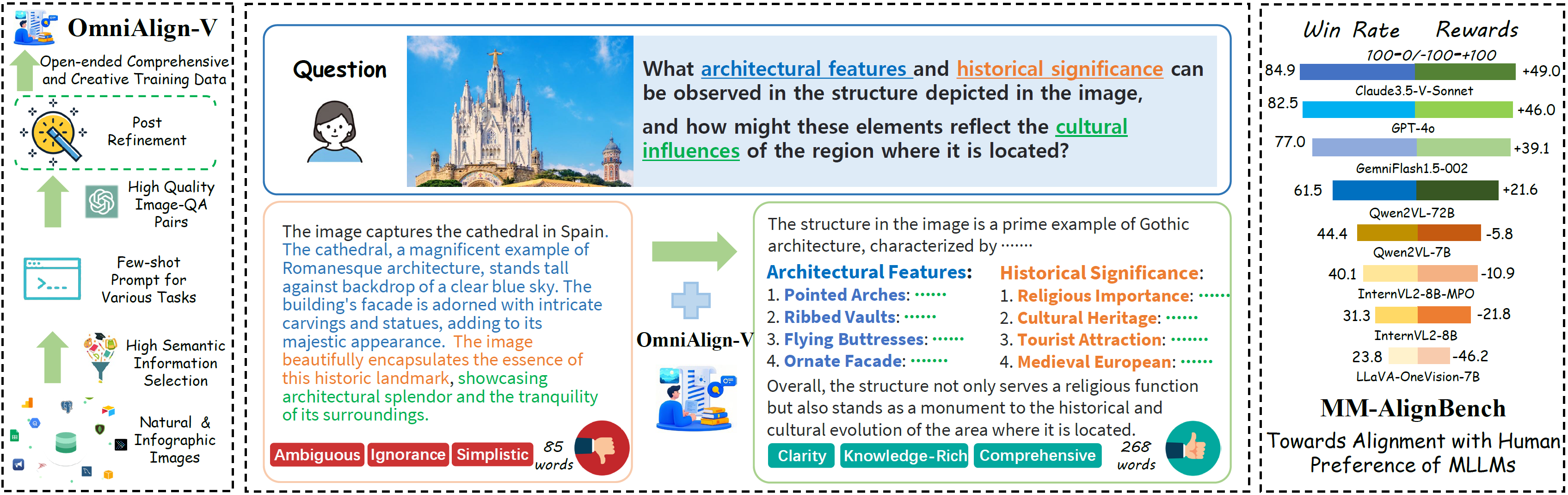์ต๊ทผ ๋ฉํฐ๋ชจ๋ฌ ์ธ์ด ๋ชจ๋ธ(Multi-modal LLM)์ ์ด๋ฏธ์ง์ ํ ์คํธ๋ฅผ ๊ฒฐํฉํ ๋ณตํฉ์ ์ถ๋ก ๋ฅ๋ ฅ ๋ฉด์์ ํฐ ๋ฐ์ ์ ์ด๋ฃจ์์ผ๋, ์์ง ์ธ๊ฐ์ ์ ํธ๋ ๊ฐ์น ํ๋จ๊ณผ์ ์ ๋ ฌ(alignment)์ ๋ถ์กฑํ ์ํ์ ๋๋ค. ์ด ๋ ผ๋ฌธ์ ์ธ๊ฐ์ ๊ฐ์น์ ์ ํธ๋ฅผ ๋ณด๋ค ์ ํํ ๋ฐ์ํ๋ ๋ฉํฐ๋ชจ๋ฌ LLM์ ๊ฐ๋ฐํ๊ธฐ ์ํด OmniAlign-V๋ผ๋ ๋๊ท๋ชจ ๊ณ ํ์ง ๋ฐ์ดํฐ์ (์ฝ 20๋ง ๊ฐ ์ํ)์ ์๋กญ๊ฒ ๊ตฌ์ถํ์ต๋๋ค. ๋ค์ํ ์ด๋ฏธ์ง์ ๋ณต์กํ ์ง๋ฌธ, ๊ทธ๋ฆฌ๊ณ ๋ค์ํ ๋ต๋ณ ํ์์ ํฌํจํ ์ด ๋ฐ์ดํฐ์ ์ ์ด์ฉํด Supervised Fine-Tuning(SFT)๊ณผ ์ง์ ์ ํธ ์ต์ ํ(DPO)๋ฅผ ์ํํ ๊ฒฐ๊ณผ, ๊ธฐ์กด์ ๋ฉํฐ๋ชจ๋ฌ ๋ชจ๋ธ ๋๋น ์ธ๊ฐ ์ ํธ์์ ์ ๋ ฌ์ด ํฌ๊ฒ ํฅ์๋์์ต๋๋ค. ์ฐ๊ตฌ์ง์ ์ด ๋ชจ๋ธ์ด ๊ธฐ๋ณธ์ ์ธ ๋ฉํฐ๋ชจ๋ฌ ๋ฅ๋ ฅ๊น์ง ์ ์งํ๊ฑฐ๋ ์คํ๋ ค ๊ฐ์ ํ๋ฉฐ ์ธ๊ฐ๊ณผ์ ์ํธ์์ฉ์ ๋์ฑ ์ ํฉํ AI ์์คํ ์ผ๋ก ์งํํ๋ค๊ณ ๊ฐ์กฐํฉ๋๋ค. ๊ด๋ จ ๋ฐ์ดํฐ์ ๊ณผ ๋ฒค์น๋งํฌ๋ ์คํ์์ค๋ก ๊ณต๊ฐ๋์์ต๋๋ค.