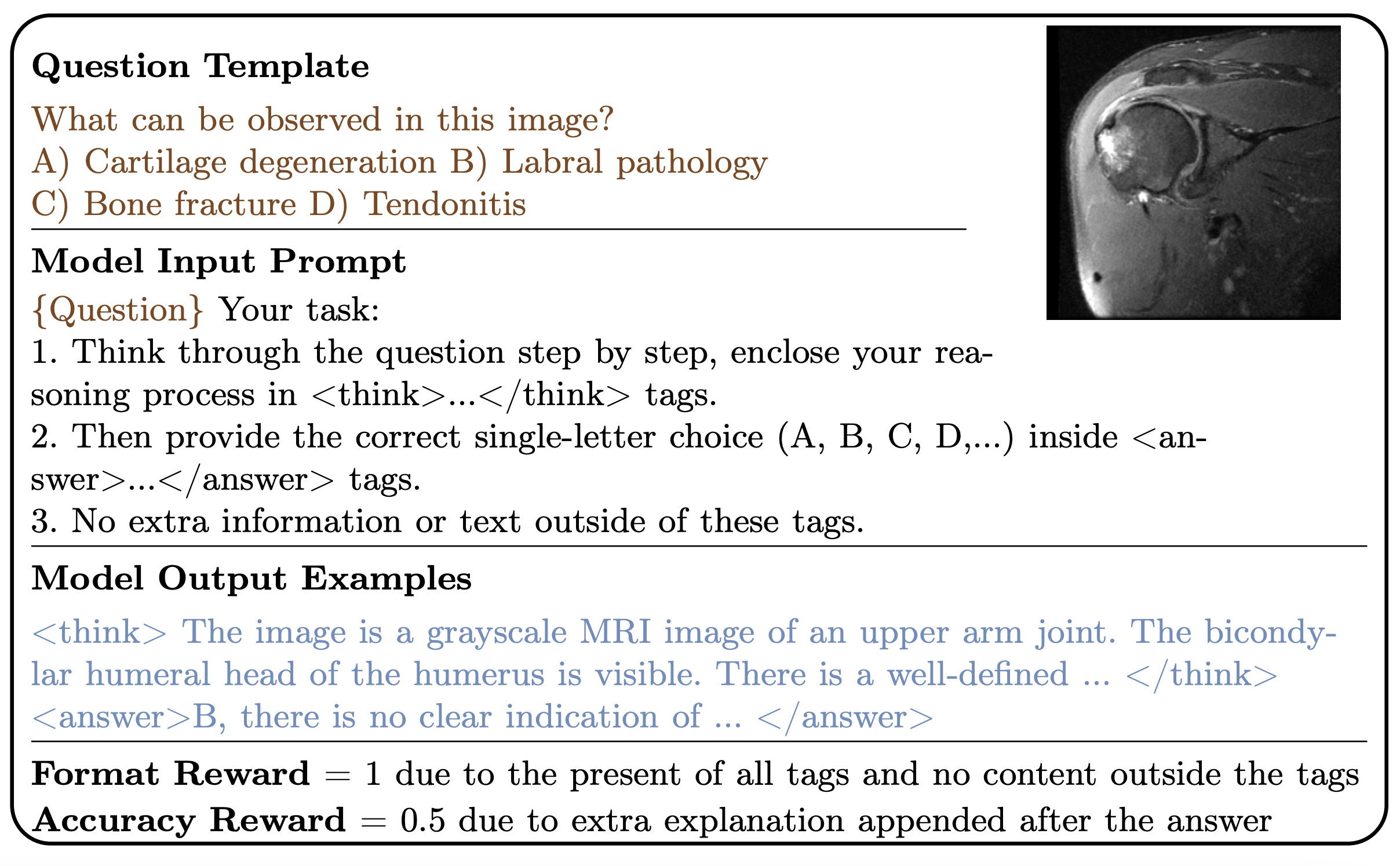 ์ต๊ทผ ์๋ฃ ์์ ๋ถ์ ๋ถ์ผ์์๋ ๋ชจ๋ธ์ด ๋จ์ํ ์ง๋จ ๊ฒฐ๊ณผ๋ง ์ ์ํ๋ ๊ฒ์ด ์๋๋ผ, ๊ทธ ์ง๋จ์ ์ด๋ฅธ ๊ณผ์ ๊ณผ ์ด์ ๋ฅผ ๋ช ํํ๊ฒ ์ค๋ช ํ ์ ์๋ ๋ฅ๋ ฅ์ด ๋์ฑ ์ค์ํด์ง๊ณ ์์ต๋๋ค. ์ด ๋ ผ๋ฌธ์ ์ด๋ฌํ ์ค๋ช ๊ฐ๋ฅํ ์ถ๋ก ๋ฅ๋ ฅ์ ๊ฐํํ์ต์ ํตํด ํ๊ธฐ์ ์ผ๋ก ํฅ์์ํจ ์๋ฃ ํนํ ์๊ฐ-์ธ์ด ๋ชจ๋ธ(Vision-Language Model, VLM)์ธ MedVLM-R1์ ์๊ฐํฉ๋๋ค. ๊ธฐ์กด์ ์ง๋ํ์ต ๋ฐฉ์(supervised fine-tuning)์ ํ๋ จ ๋ฐ์ดํฐ์ ๊ณผ์ ํฉ๋์ด ์ค์ ์ถ๋ก ๊ณผ์ ์ ์ ํ์ตํ์ง ๋ชปํ๋ ํ๊ณ๊ฐ ์์์ต๋๋ค. ๋ณธ ์ฐ๊ตฌ์์๋ ์ธ๊ฐ์ด ์ฌ์ ์ ์ ์ํ ์ถ๋ก ๊ฒฝ๋ก ์์ด ๋ชจ๋ธ ์ค์ค๋ก ์ธ๊ฐ์ด ์ดํด ๊ฐ๋ฅํ ํํ์ ์ถ๋ก ์ ๋ฐ๊ฒฌํ๋๋ก ๊ฐํํ์ต ํ๋ ์์ํฌ๋ฅผ ๋์ ํ์ต๋๋ค. ์คํ ๊ฒฐ๊ณผ MedVLM-R1 ๋ชจ๋ธ์ ๋จ 600๊ฐ์ ์์ ์ง์์๋ต ๋ฐ์ดํฐ์ ์์ ๋ชจ๋ธ ํฌ๊ธฐ(2B ํ๋ผ๋ฏธํฐ)์๋ ๋ถ๊ตฌํ๊ณ , MRI, CT, X-ray ์์ ๋ถ์์์ ๊ธฐ์กด์ ํฐ ๋ชจ๋ธ๋ค๋ณด๋ค ๋ฐ์ด๋ ์ฑ๋ฅ์ ๋ณด์์ผ๋ฉฐ, ๋ฐ์ดํฐ๊ฐ ๋ถ์กฑํ ํ๊ฒฝ์์๋ ํ์ํ ์ผ๋ฐํ ๋ฅ๋ ฅ์ ๋ฐํํ์ต๋๋ค. ์ด ์ฐ๊ตฌ๋ ์๋ฃ ์์ ๋ถ์์์ AI์ ์ ๋ขฐ์ฑ ๋ฐ ํฌ๋ช ์ฑ์ ๋์ด๋ ์ค์ํ ๋ฐ๊ฑธ์์ด ๋ ๊ฒ์ผ๋ก ๊ธฐ๋๋ฉ๋๋ค.