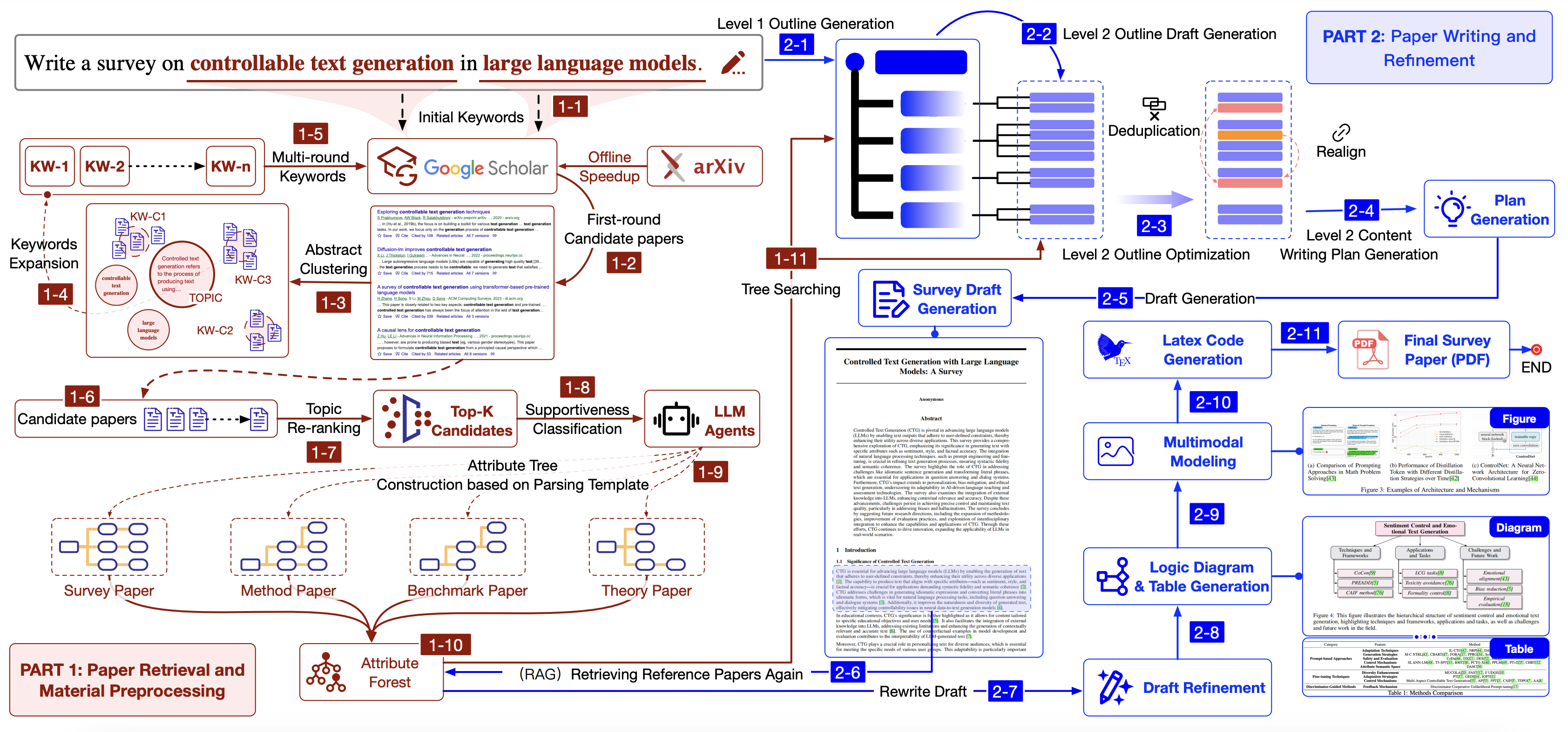 ์ด ๋ ผ๋ฌธ์ ๋ํ ์ธ์ด ๋ชจ๋ธ(LLM)์ ๋ฐ์ด๋ ์ดํด๋ ฅ๊ณผ ๋ฐฉ๋ํ ์ง์์ ํ์ฉํ์ฌ ํ์ ์ ์ค๋ฌธ์กฐ์ฌ๋ฅผ ์๋์ผ๋ก ์์ฑํ๋ ํ์ ์ ์ธ ์์คํ ์ ์๊ฐํฉ๋๋ค. ๊ธฐ์กด์ ์๋ ์ค๋ฌธ ์์ฑ ์ฐ๊ตฌ๋ ๋งฅ๋ฝ ์ฐฝ์ ์ ํ์ฑ์ด๋ ์ฌ๋ ์๋ ๋ด์ฉ ๋ถ์กฑ ๋ฑ ๋ค์ํ ํ๊ณ๊ฐ ์์์ต๋๋ค. ์ด๋ฅผ ๊ทน๋ณตํ๊ธฐ ์ํด ์ฐ๊ตฌ์ง์ ์ธ๊ฐ์ด ์ค์ ๋ก ์ค๋ฌธ์ ์์ฑํ ๋ ์ฌ์ฉํ๋ ๋จ๊ณ์ ์ ๊ทผ๋ฒ์ ๋ณธ๋ฌ ์ฒด๊ณ์ ์ธ ์์คํ ์ธ SurveyX๋ฅผ ๊ฐ๋ฐํ์ต๋๋ค. SurveyX ์์คํ ์ ํฌ๊ฒ ์ค๋น ๋จ๊ณ์ ์์ฑ ๋จ๊ณ๋ผ๋ ๋ ๋จ๊ณ๋ก ๊ตฌ๋ถ๋ฉ๋๋ค. ์ค๋น ๋จ๊ณ์์๋ ์จ๋ผ์ธ์์ ์ค์๊ฐ์ผ๋ก ์ฐธ๊ณ ์๋ฃ๋ฅผ ์๋์ผ๋ก ๊ฒ์ํ์ฌ ํ๋ถํ ํ์ ์ ๋ณด๋ฅผ ์์งํ๊ณ , AttributeTree๋ผ๋ ๋ ์์ ์ธ ์ ๋ณด ๊ตฌ์กฐํ ๊ธฐ๋ฒ์ ํตํด ์ด๋ฅผ ์ฒด๊ณ์ ์ผ๋ก ์ ๋ฆฌํฉ๋๋ค. ์ด์ด์ง๋ ์์ฑ ๋จ๊ณ์์๋ ์ด๋ ๊ฒ ์ค๋น๋ ์๋ฃ๋ฅผ ๊ธฐ๋ฐ์ผ๋ก ์ค๋ฌธ ๋ฌธํญ์ ์์ฑํ ๋ค, ์ต์ข ์ ์ผ๋ก ๊ฒฐ๊ณผ๋ฌผ์ ํ ๋ฒ ๋ ์ ๊ตํ๊ฒ ๋ค๋ฌ๋(re-polishing) ๊ณผ์ ์ ๊ฑฐ์นฉ๋๋ค. ์คํ ๊ฒฐ๊ณผ SurveyX๋ ์ฝํ ์ธ ํ์ง๊ณผ ์ธ์ฉ ํ์ง ๋ฉด์์ ๋ชจ๋ ๊ธฐ์กด์ ์ค๋ฌธ ์๋ํ ์์คํ ์ ํฐ ์ฐจ์ด๋ก ๋ฅ๊ฐํ์ผ๋ฉฐ, ์ผ๋ถ ์งํ์์๋ ์ธ๊ฐ ์ ๋ฌธ๊ฐ ์์ค์ ์ฑ๋ฅ์ ๊ทผ์ ํ์ต๋๋ค. ์ฐ๊ตฌ์ง์ ์ค์ ์์๋ค์ ๊ณต๊ฐํ์ฌ ํ์ ์ ์ค๋ฌธ ์ฐ๊ตฌ๋ฅผ ์ํํ๋ ์ฐ๊ตฌ์๋ค์๊ฒ ์ค์ง์ ์ธ ๋์์ ์ ๊ณตํ๊ณ ์์ต๋๋ค.