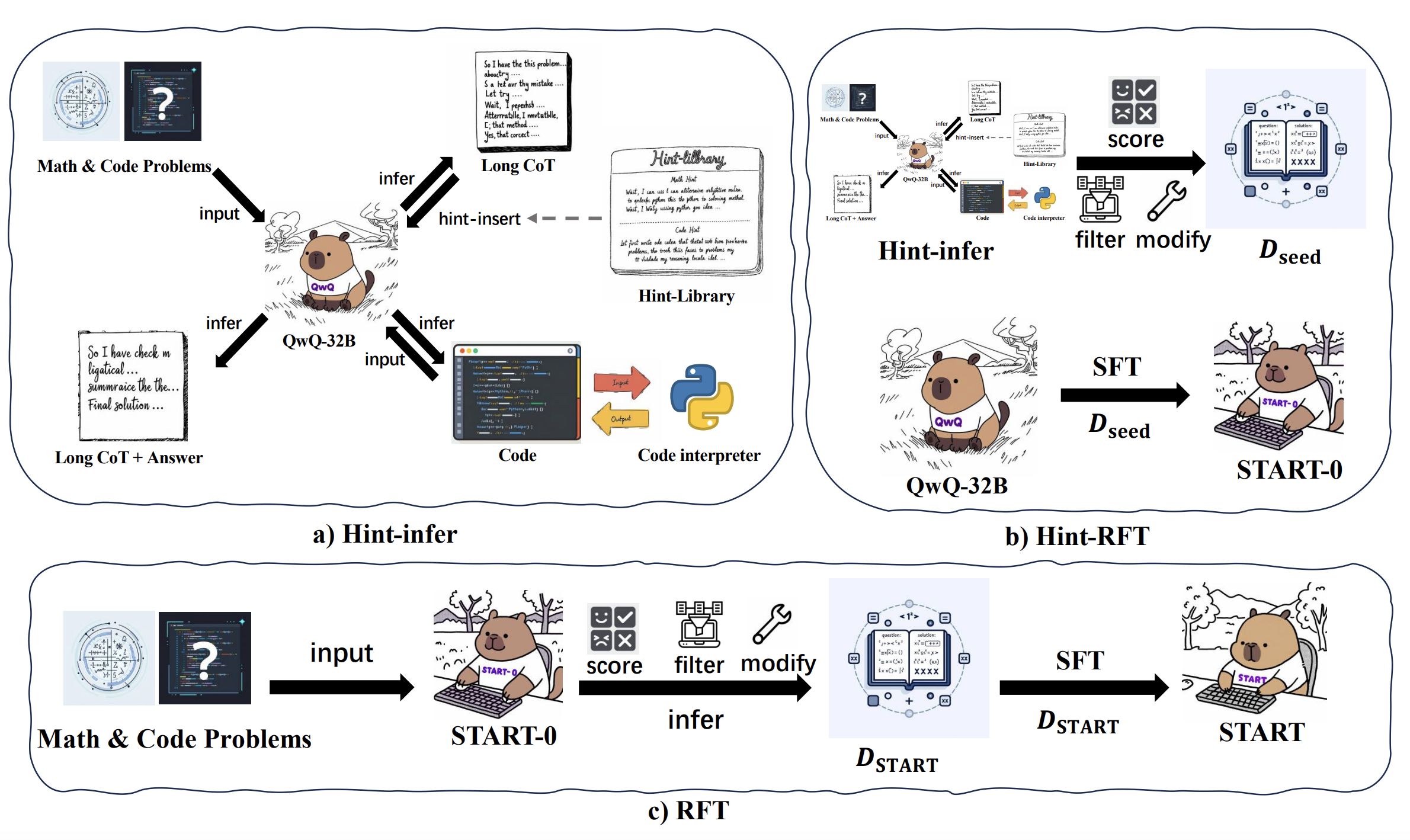 ๊ธฐ์กด์ ๊ฑฐ๋ ์ถ๋ก ๋ชจ๋ธ(LRM)์ ๋ด๋ถ์ ๊ธด ์ถ๋ก ๊ณผ์ ๋ง์ ์ฌ์ฉํ๊ธฐ ๋๋ฌธ์ ํ๊ฐ ํ์์ด๋ ๋นํจ์จ์ฑ ๋ฌธ์ ๋ฅผ ์์ฃผ ๊ฒช์ต๋๋ค. ๋ณธ ์ฐ๊ตฌ๋ ์ฝ๋ ์คํ๊ณผ ๊ฐ์ ์ธ๋ถ ๋๊ตฌ ํ์ฉ์ ํตํด ์ถ๋ก ์ฑ๋ฅ์ ๋์ด๋ START ๋ชจ๋ธ์ ์ ์ํฉ๋๋ค. ํนํ, ์ถ๋ก ์ค ์ธ์์ ์ผ๋ก ์ฝ์ ๋ ํํธ๋ฅผ ํตํด ๋ชจ๋ธ์ด ๋๊ตฌ ์ฌ์ฉ ์ฌ๋ถ๋ฅผ ์ค์ค๋ก ๊ฒฐ์ ํ๊ฒ ํ๋ 'ํํธ ์ถ๋ก (Hint-infer)' ๋ฐฉ๋ฒ๊ณผ ์ด๋ฅผ ๊ธฐ๋ฐ์ผ๋ก ๋ฏธ์ธ์กฐ์ ์ ์ํํ๋ 'ํํธ ๊ฑฐ๋ถ ์ํ๋ง ๋ฏธ์ธ์กฐ์ (Hint-RFT)' ๊ธฐ์ ์ ๋์ ํฉ๋๋ค. ์ด๋ฅผ ํตํด START ๋ชจ๋ธ์ ์ํ, ๊ณผํ, ์ฝ๋ฉ ๋ฑ ๋ณต์กํ ๋ฌธ์ ์์ ๊ธฐ์กด ๋ชจ๋ธ ๋๋น ๋ฐ์ด๋ ์ฑ๋ฅ ํฅ์์ ๋ณด์ฌ์ค๋๋ค.