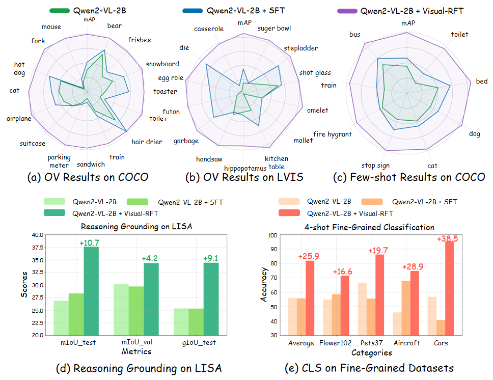 ๊ฐํํ์ต ๋ฏธ์ธ์กฐ์ (RFT)์ ์ ๋ต์ ๋ํ ํผ๋๋ฐฑ์ ๋ฐํ์ผ๋ก ๋ชจ๋ธ์ ํ๋ จํ๋ ๊ธฐ๋ฒ์ผ๋ก, ์ฃผ๋ก ์ธ์ด ๊ณผ์ ์์ ์ฑ๊ณต์ ์ผ๋ก ์ฌ์ฉ๋์์ต๋๋ค. ํ์ง๋ง ์๊ฐ ๋ถ์ผ์์๋ ์์ง ์ ๋๋ก ํ์ฉ๋์ง ์์์ต๋๋ค. ๋ณธ ๋ ผ๋ฌธ์์๋ ์๊ฐ ๊ณผ์ ๋ฅผ ์ํ Visual-RFT ๊ธฐ๋ฒ์ ์ ์ํฉ๋๋ค. ์ด ๋ฐฉ๋ฒ์ ๋๊ท๋ชจ ์๊ฐ์ธ์ด ๋ชจ๋ธ(LVLM)์ ์ฌ์ฉํด ๋ค์ํ ์๋ต์ ์์ฑํ ๋ค, ์๊ฐ ๋ณด์ ํจ์๋ฅผ ์ ์ฉํด ๋ชจ๋ธ์ ์ต์ ํํฉ๋๋ค. ์คํ ๊ฒฐ๊ณผ Visual-RFT๋ ์ธ๋ฐํ ์ด๋ฏธ์ง ๋ถ๋ฅ๋ ์์์ท ๊ฐ์ฒด ํ์ง ๋ฑ ์ฌ๋ฌ ๊ณผ์ ์์ ๊ธฐ์กด ์ง๋ํ์ต(SFT) ๊ธฐ๋ฐ ๋ฐฉ๋ฒ๋ณด๋ค ๋ฐ์ด๋ ์ฑ๋ฅ๊ณผ ์ฐ์ํ ์ผ๋ฐํ ๋ฅ๋ ฅ์ ๋ณด์ฌ์ค๋๋ค.
