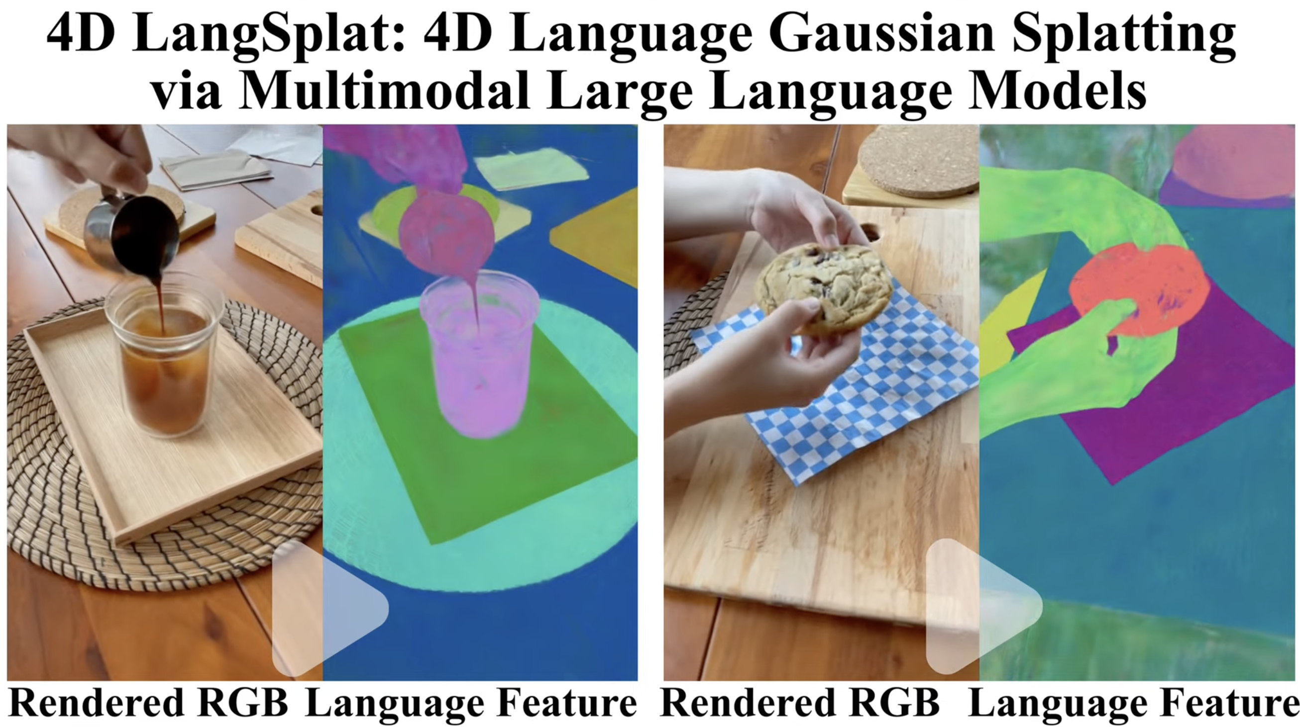 ์๊ฐ์ ๋ฏผ๊ฐํ๊ณ ๊ฐ๋ฐฉ์ ์ธ ์ธ์ด ์ง์(open-ended language queries)๋ฅผ ์ฒ๋ฆฌํ๋ 4์ฐจ์(4D) ์ธ์ด ํ๋๋ฅผ ๋์ (dynamic) ์ฅ๋ฉด์์ ํ์ตํ๋ ๊ฒ์ ํ์ค ์์ฉ ๋ถ์ผ์์ ํ์์ ์ ๋๋ค. ๊ธฐ์กด์ LangSplat์ 3D ์ ์ ์ฅ๋ฉด์์ CLIP ํน์ง์ Gaussian ํํ์ผ๋ก groundingํ๋ ๋ฐ ์ฑ๊ณตํ์ง๋ง, CLIP์ ์ ์ ์ด๋ฏธ์ง-ํ ์คํธ ์์ ์ ์ํด ์ค๊ณ๋์ด ์์ด ๋น๋์ค์ ์๊ฐ์ ์ญํ์ ํฌ์ฐฉํ์ง ๋ชปํฉ๋๋ค. ์ด๋ฅผ ๊ทน๋ณตํ๊ธฐ ์ํด ๋ณธ ๋ ผ๋ฌธ์์๋ 4D LangSplat์ ์ ์ํฉ๋๋ค. ๋ณธ ์ฐ๊ตฌ๋ ๋ฉํฐ๋ชจ๋ฌ ๋ํ ์ธ์ด๋ชจ๋ธ(MLLM)์ ํ์ฉํ multimodal object-wise video prompting ๋ฐฉ์์ ํตํด, ์๊ฐ ๋ฐ ํ ์คํธ ํ๋กฌํํธ๋ฅผ ์ฌ์ฉํ์ฌ ๋น๋์ค ๋ด ๊ฐ์ฒด์ ๋ํด ์๊ฐ์ ์ผ๋ก ์ผ๊ด๋๊ณ ๋์ ํ์ง์ ์์ธํ ์บก์ ์ ์์ฑํฉ๋๋ค. ์์ฑ๋ ์บก์ ์ LLM์ ์ด์ฉํด ๋ฌธ์ฅ ์๋ฒ ๋ฉ์ผ๋ก ๋ณํํ์ฌ ํฝ์ ๋จ์๋ก ๊ฐ์ฒด์ ๋ง์ถ ํน์ง(feature)์ supervision์ผ๋ก ํ์ฉํฉ๋๋ค. ์ด๋ฅผ ํตํด ๊ฐ๋ฐฉํ ์ธ์ด ์ง์(open-vocabulary queries)๋ฅผ ์ ๋ฐํ๊ฒ ์ฒ๋ฆฌํ ์ ์๊ฒ ๋์์ต๋๋ค.