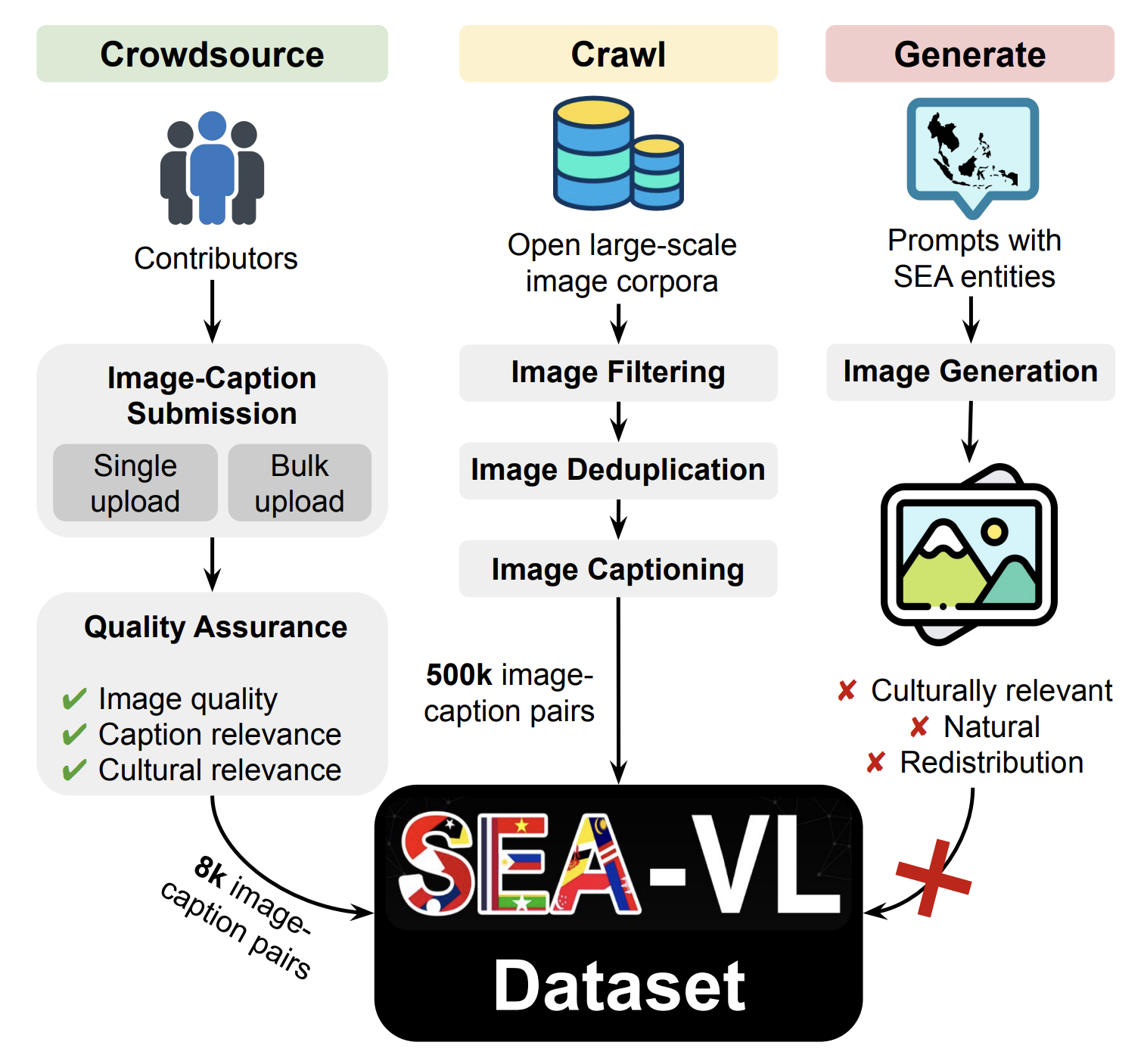 ๋๋จ์์์(SEA)๋ ์ธ์ด์ ยท๋ฌธํ์ ์ผ๋ก ๋งค์ฐ ๋ค์ํ์ง๋ง, ๋น์ -์ธ์ด(VL) ์ฐ๊ตฌ์์ ํฌ๊ฒ ์์ธ๋์ด ์์ต๋๋ค. ์ด๋ AI ๋ชจ๋ธ์ด ๋๋จ์์์ ๋ฌธํ์ ๋์์ค๋ฅผ ํฌ์ฐฉํ์ง ๋ชปํ๋ ๊ฒฐ๊ณผ๋ฅผ ์ด๋ํฉ๋๋ค. ์ด๋ฅผ ํด๊ฒฐํ๊ธฐ ์ํด ๋ณธ ๋ ผ๋ฌธ์ ๋๋จ์์์ ์ธ์ด์ ๋ง์ถ ๊ณ ํ์ง์ ๋ฌธํ ๊ด๋ จ ๋ฐ์ดํฐ์ ๊ตฌ์ถ์ ๋ชฉํ๋ก ํ๋ ์คํ์์ค ์ด๋์ ํฐ๋ธ์ธ SEA-VL์ ์ ์ํฉ๋๋ค. SEA ๊ตญ๊ฐ์ ๊ธฐ์ฌ์๋ค์ด ์ฐธ์ฌํ์ฌ ๋ฌธํ์ ๊ด๋ จ์ฑ๊ณผ ๋ค์์ฑ์ ๋ณด์ฅํ์์ผ๋ฉฐ, ํฌ๋ผ์ฐ๋์์ฑ์ ๋์ด ์น ํฌ๋กค๋ง๊ณผ ์ด๋ฏธ์ง ์์ฑ ๋ฑ ์๋ํ๋ ์ด๋ฏธ์ง ์์ง ๋ฐฉ์์ ์ถ๊ฐ๋ก ํ์ํ์์ต๋๋ค. ์ฐ๊ตฌ ๊ฒฐ๊ณผ, ์ด๋ฏธ์ง ํฌ๋กค๋ง์ ํฌ๋ผ์ฐ๋์์ฑ ๋๋น ๋น์ฉ ๋ฐ ์๊ฐ ํจ์จ์ ์ด๋ฉด์ ์ฝ 85%์ ๋ฌธํ์ ์ ํฉ์ฑ์ ๋ฌ์ฑํ์ง๋ง, ์์ฑ๋ ์ด๋ฏธ์ง๋ ์ฌ์ ํ SEA ๋ฌธํ์ ๋ฏธ๋ฌํ ์ ํต๊ณผ ๋ฌธํ์ ๋งฅ๋ฝ์ ์ ํํ ๋ฐ์ํ์ง ๋ชปํ์ต๋๋ค. ๊ฒฐ๋ก ์ ์ผ๋ก ์ด 128๋ง ๊ฐ์ SEA ๋ฌธํ ๊ด๋ จ ์ด๋ฏธ์ง๋ฅผ ์์งํ์ผ๋ฉฐ, ์ด๋ ๊ธฐ์กด ๋ฐ์ดํฐ์ ๋ณด๋ค 50๋ฐฐ ์ด์ ํฐ ๊ท๋ชจ์ ๋๋ค.