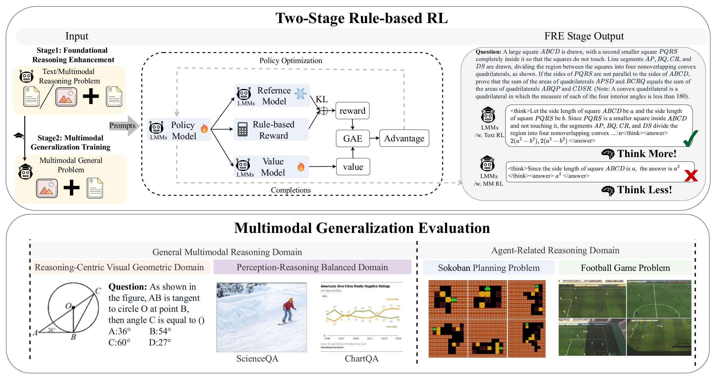 ๋๊ท๋ชจ ๋ฉํฐ๋ชจ๋ฌ ๋ชจ๋ธ(LMM)์ ์ถ๋ก ๋ฅ๋ ฅ ๊ฐํ๋ ํนํ ์๊ท๋ชจ ๋ชจ๋ธ(3B)์์ ์๊ฐ ์ธ์ง์ ๋ ผ๋ฆฌ์ ์ถ๋ก ๊ฐ ๋ณต์กํ ์ํธ์์ฉ์ผ๋ก ์ธํด ๋ง์ ์ด๋ ค์์ ๊ฒช๊ณ ์์ต๋๋ค. ํ ์คํธ ๊ธฐ๋ฐ์์๋ rule-based ๊ฐํํ์ต(RL)์ด ์ฐ์ํ ์ฑ๋ฅ์ ๋ณด์์ง๋ง, ์ด๋ฅผ ๋ฉํฐ๋ชจ๋ฌ๋ก ํ์ฅํ ๋ ๋ฐ์ดํฐ ๋ถ์กฑ๊ณผ ๋ชจํธํ ์ ๋ต์ผ๋ก ์ธํ ํ๊ณ๊ฐ ์์ต๋๋ค. ๋ณธ ๋ ผ๋ฌธ์ ๋ ๋จ๊ณ๋ก ๊ตฌ์ฑ๋ rule-based RL ํ๋ ์์ํฌ์ธ LMM-R1์ ์ ์ํฉ๋๋ค. ์ฒซ ๋ฒ์งธ ๋จ๊ณ์ธ Foundational Reasoning Enhancement(FRE)์์๋ ํ ์คํธ ๋ฐ์ดํฐ๋ฅผ ์ด์ฉํ rule-based RL๋ก ์ถ๋ก ๋ฅ๋ ฅ์ ๊ฐํํ๊ณ , ์ดํ ๋ ๋ฒ์งธ ๋จ๊ณ(Multimodal Generalization Training, MGT)์์๋ ๊ฐํ๋ ์ถ๋ก ๋ฅ๋ ฅ์ ๋ฉํฐ๋ชจ๋ฌ ์์ญ์ผ๋ก ์ผ๋ฐํํฉ๋๋ค. Qwen2.5-VL-Instruct-3B๋ฅผ ์ด์ฉํ ์คํ์์ ๋ฉํฐ๋ชจ๋ฌ ๋ฒค์น๋งํฌ์์ ํ๊ท 4.83%, ํ ์คํธ ๋ฒค์น๋งํฌ์์ 4.5%, ๋ณต์กํ Football Game ๊ณผ์ ์์ 3.63% ์ฑ๋ฅ ํฅ์์ ๋ณด์์ต๋๋ค.