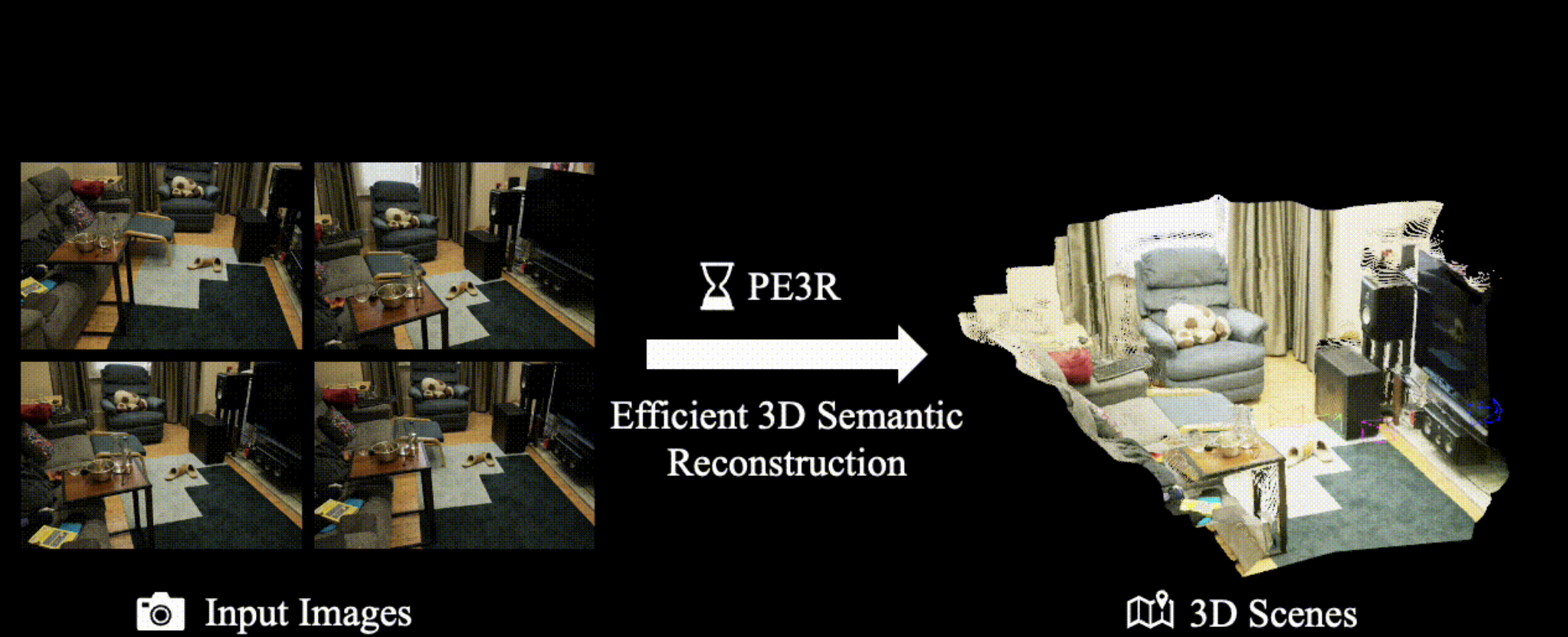 ์ต๊ทผ 2D์์ 3D๋ก์ ์ง๊ฐ(perception) ๊ธฐ์ ๋ฐ์ ์ผ๋ก 2D ์ด๋ฏธ์ง๋ก๋ถํฐ 3D ์ฅ๋ฉด์ ์ดํดํ๋ ๋ฅ๋ ฅ์ด ํฌ๊ฒ ํฅ์๋์์ง๋ง, ๊ธฐ์กด ๋ฐฉ๋ฒ์ ์ ํ๋ ์ฅ๋ฉด ์ผ๋ฐํ, ๋ถ์ถฉ๋ถํ ์ง๊ฐ ์ ํ๋, ๋๋ฆฐ ์ฌ๊ตฌ์ฑ ์๋๋ผ๋ ์ฌ๊ฐํ ๋ฌธ์ ๋ฅผ ๊ฒช๊ณ ์์ต๋๋ค. ์ด๋ฅผ ํด๊ฒฐํ๊ธฐ ์ํด ๋ณธ ์ฐ๊ตฌ๋ ์ ํ์ฑ๊ณผ ํจ์จ์ฑ์ ๋ชจ๋ ๊ฐ์ ํ Perception-Efficient 3D Reconstruction(PE3R)์ ์ ์ํฉ๋๋ค. PE3R์ ํผ๋ํฌ์๋(feed-forward) ์ํคํ ์ฒ๋ฅผ ํ์ฉํ์ฌ ๋น ๋ฅธ 3D semantic field ์ฌ๊ตฌ์ฑ์ ๊ฐ๋ฅํ๊ฒ ํฉ๋๋ค. ๋ค์ํ ์ฅ๋ฉด๊ณผ ๊ฐ์ฒด์ ๋ํด ๋ฐ์ด๋ zero-shot ์ผ๋ฐํ ๋ฅ๋ ฅ์ ๋ณด์์ผ๋ฉฐ, ์คํ ๊ฒฐ๊ณผ 3D semantic field ์ฌ๊ตฌ์ฑ ์๋์์ ์ต์ 9๋ฐฐ์ ๊ฐ์ํ๋ฅผ ์ด๋ฃจ๋ฉด์๋ ์ง๊ฐ ์ ํ๋ ๋ฐ ์ฌ๊ตฌ์ฑ ์ ๋ฐ๋๋ฅผ ํฌ๊ฒ ๊ฐ์ ํ์์ต๋๋ค.