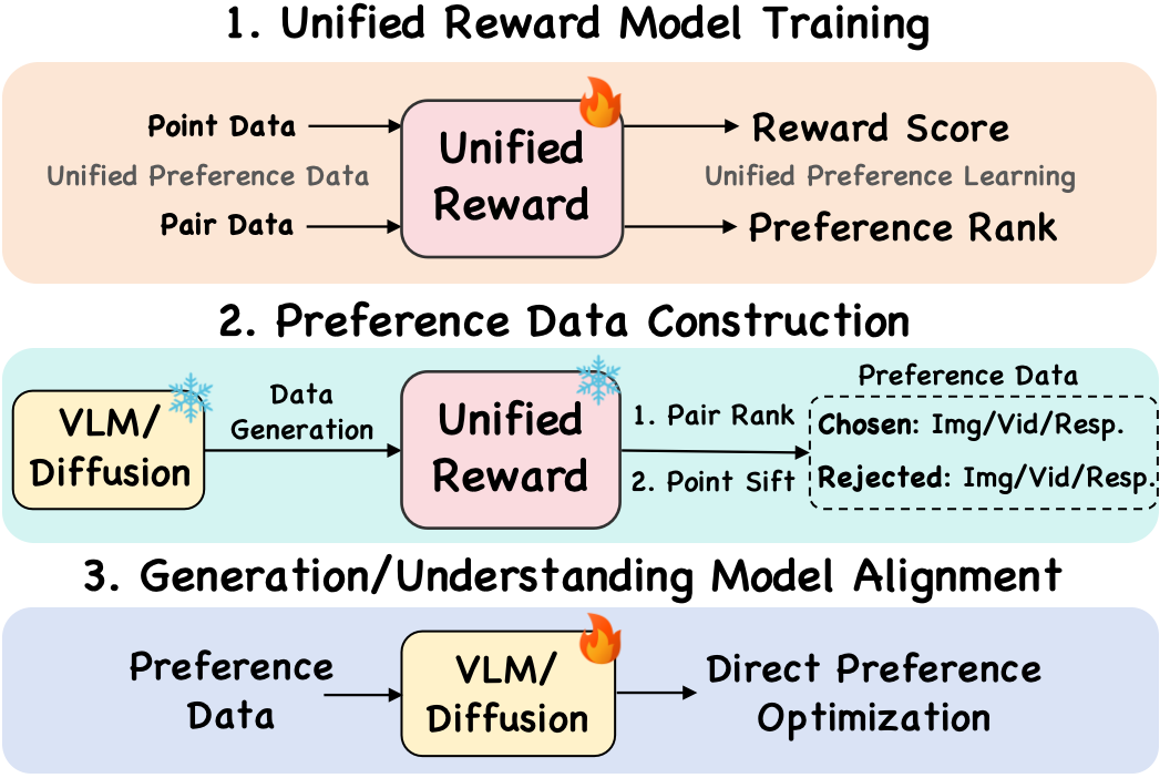 ์ต๊ทผ ์ฌ๋์ ์ ํธ๋ ์ ๋ ฌ(Human Preference Alignment)์ ๋ฐ์ ์ ๋ฉํฐ๋ชจ๋ฌ ์์ฑ ๋ฐ ์ดํด ๋ฅ๋ ฅ์ ํฌ๊ฒ ํฅ์์์ผฐ์ต๋๋ค. ๋ํ์ ์ธ ์ ๊ทผ๋ฒ์ ๋ณด์ ๋ชจ๋ธ์ ํ์ตํ์ฌ ์ ํธ๋๋ฅผ ์ต์ ํํ๋ ๊ฒ์ด์ง๋ง, ๊ธฐ์กด ๋ชจ๋ธ์ ์์ ๋ณ๋ก ํนํ๋์ด ๋ค์ํ ์๊ฐ์ ์์ฉ ํ๋ก๊ทธ๋จ์์์ ์ ์์ฑ์ด ์ ํ๋์์ต๋๋ค. ๋ณธ ๋ ผ๋ฌธ์ ๋ค์ํ ์์ ์ ๊ณต๋์ผ๋ก ํ๊ฐํ ๋ ์ด๋ฏธ์ง ์ดํด๊ฐ ์ด๋ฏธ์ง ์์ฑ ํ๊ฐ๋ฅผ ํฅ์์ํค๊ณ , ๊ฐ์ ๋ ์ด๋ฏธ์ง ํ๊ฐ๊ฐ ๋น๋์ค ํ๊ฐ์๋ ๋์์ด ๋๋ ๋ฑ ์ํธ ๊ฐ ์๋์ง ํจ๊ณผ๋ฅผ ์ด์งํ ์ ์๋ค๊ณ ์ฃผ์ฅํฉ๋๋ค. ์ด๋ฅผ ๋ฐํ์ผ๋ก ์ด๋ฏธ์ง์ ๋น๋์ค์ ์์ฑ ๋ฐ ์ดํด ์์ ์ ๋ชจ๋ ํฌํจํ๋ ๋๊ท๋ชจ ์ธ๊ฐ ์ ํธ๋ ๋ฐ์ดํฐ์ ์์ ํ๋ จํ ์ต์ด์ ํตํฉ ๋ณด์ ๋ชจ๋ธ์ธ UnifiedReward๋ฅผ ์ ์ํฉ๋๋ค. ์ด ๋ชจ๋ธ์ pairwise ranking ๋ฐ pointwise scoring ๋ฐฉ์์ ๋ชจ๋ ์ง์ํ์ฌ ๋น์ ๋ชจ๋ธ์ ์ ํธ๋ ์ ๋ ฌ(preference alignment)์ ํ์ฉํ ์ ์์ต๋๋ค. ์คํ ๊ฒฐ๊ณผ, ๋ค์ํ ์๊ฐ์ ์์ ์ ํ๊ฐ๋ฅผ ๊ณต๋์ผ๋ก ํ์ตํ๋ ๊ฒ์ด ์๋ก์๊ฒ ์๋นํ ์ด์ ์ ์ ๊ณตํจ์ ์ ์ฆํ์์ต๋๋ค.