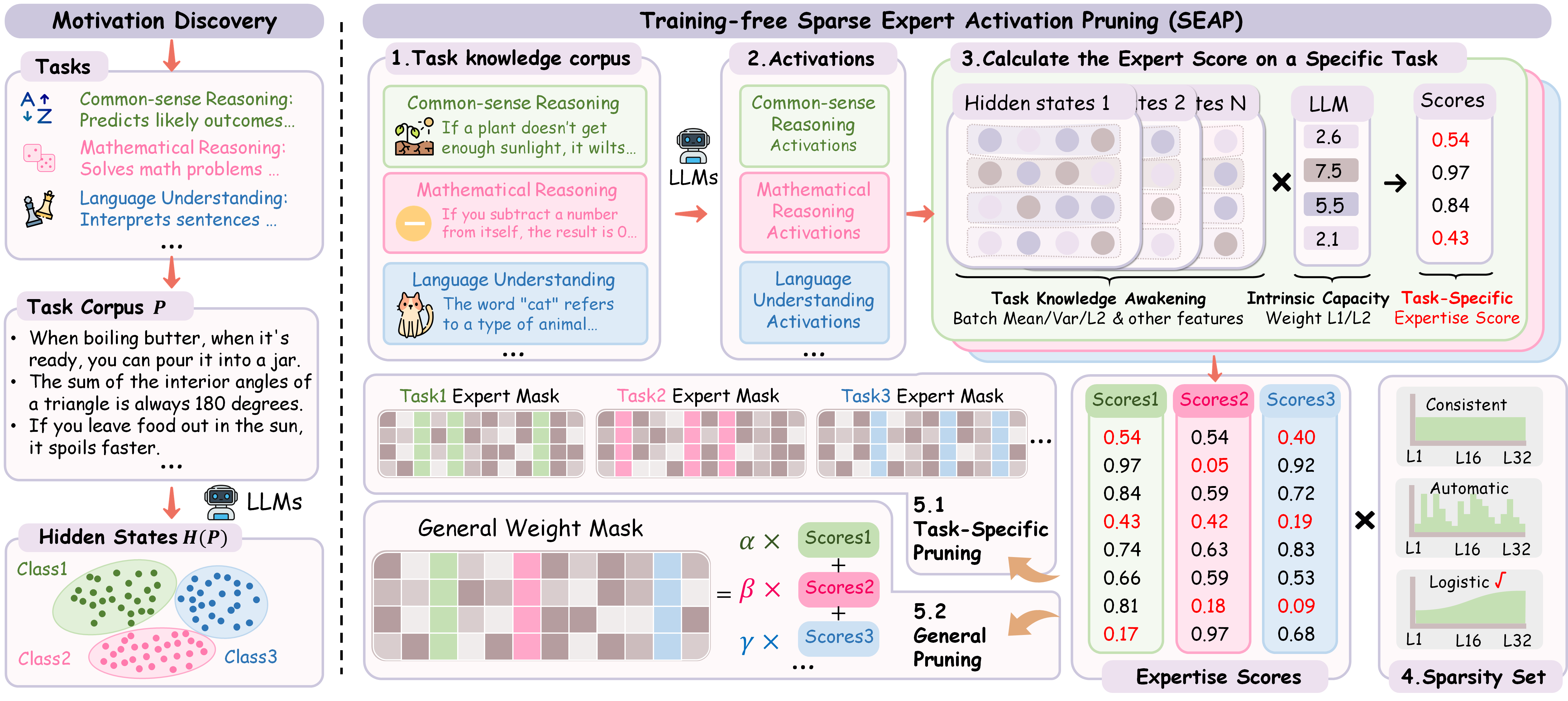 ๋๊ท๋ชจ ์ธ์ด๋ชจ๋ธ(LLM)์ ๋ค์ํ ์์ฐ์ด ์ฒ๋ฆฌ ์์ ์์ ๋ฐ์ด๋ ์ฑ๊ณผ๋ฅผ ๊ฑฐ๋์์ผ๋, ์ถ๋ก ์ ๋์ ๊ณ์ฐ ๋น์ฉ์ด ์ฃผ์ํ ์ฅ์ ๋ฌผ๋ก ๋จ์์์ต๋๋ค. ๋ณธ ๋ ผ๋ฌธ์ ์ถ๋ก ๊ณผ์ ์์ ์์ ๊ณผ ๊ด๋ จ๋ ํ๋ผ๋ฏธํฐ๋ง ์ ํ์ ์ผ๋ก ์ ์งํ์ฌ ์ถ๋ก ๋น์ฉ์ ์ค์ด๋, ํ์ต์ด ํ์ ์๋ ๊ฐ์ง์น๊ธฐ(pruning) ๊ธฐ๋ฒ์ธ Sparse Expert Activation Pruning(SEAP)์ ์๊ฐํฉ๋๋ค. SEAP์ LLM์ hidden state์ ํ์ฑํ์์ ๋ํ๋๋ ํด๋ฌ์คํฐ๋ง ํจํด์ ์ฐฉ์ํ์ฌ, ์์ ์ ํนํ๋ ์ ๋ฌธ๊ฐ(expert) ํ์ฑํ ํจํด์ ์๋ณํ๊ณ ๋ชจ๋ธ ์ฑ๋ฅ์ ์ ์งํ๋ฉด์ ์ฐ์ฐ ํจ์จ์ฑ์ ํฅ์์ํต๋๋ค. ์คํ ๊ฒฐ๊ณผ, SEAP์ ๊ฒฝ์๋ ฅ ์๋ ์ ํ์ฑ์ ์ ์งํ๋ฉด์๋ ๊ณ์ฐ ์ค๋ฒํค๋๋ฅผ ํฌ๊ฒ ๊ฐ์์ํต๋๋ค. ํนํ, 50% pruning์์ ๊ธฐ์กด ๋ฐฉ๋ฒ์ธ WandA์ FLAP์ 20% ์ด์ ๋ฅ๊ฐํ์ผ๋ฉฐ, 20% pruning์์๋ ์๋ณธ ๋ฐ์ง ๋ชจ๋ธ(dense model)์ ๋นํด ์ฑ๋ฅ์ด ๋จ์ง 2.2%๋ง ์ ํ๋์์ต๋๋ค. ์ด๋ฌํ ๊ฒฐ๊ณผ๋ SEAP์ ํ์ฅ์ฑ๊ณผ ํจ์จ์ฑ์ ์ ์ฆํ๋ฉฐ, ๋๊ท๋ชจ LLM ์ต์ ํ์ ์ ๋งํ ์ ๊ทผ๋ฒ์์ ์์ฌํฉ๋๋ค.