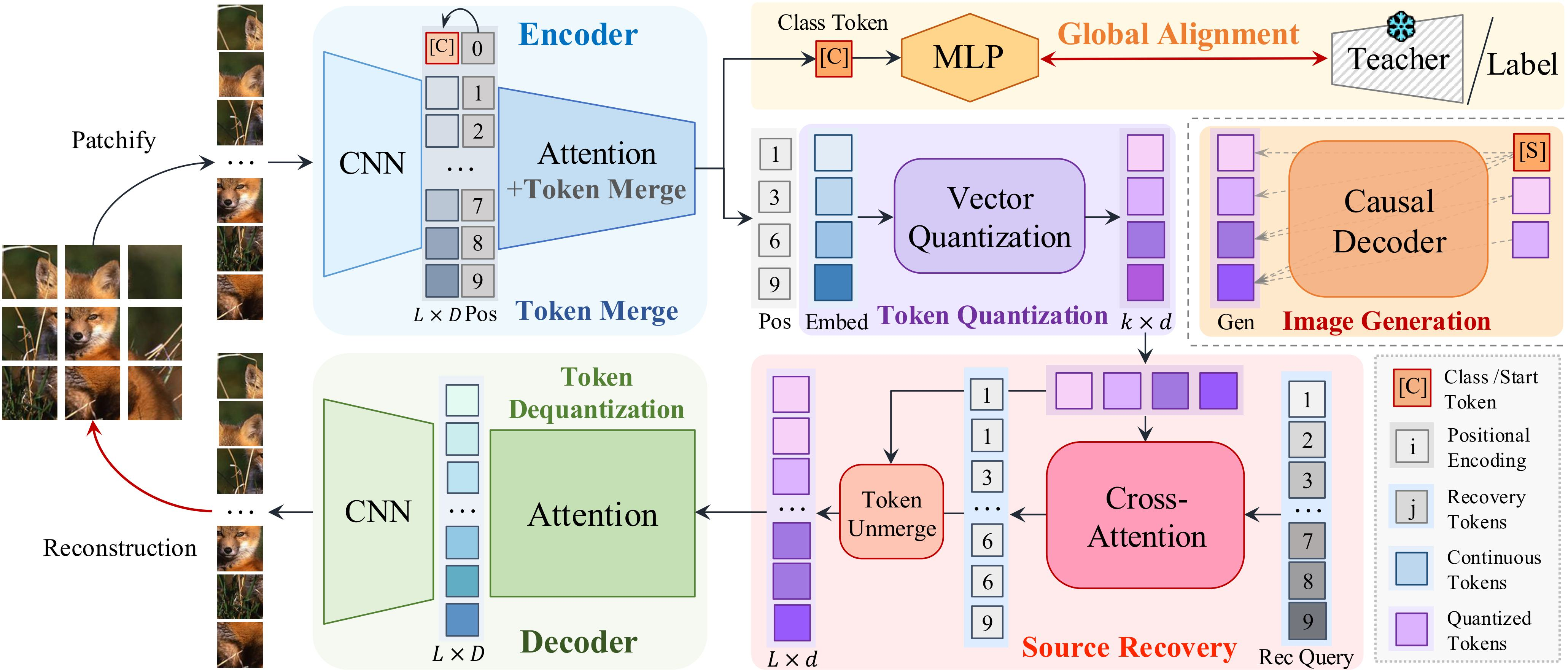 MergeVQ๋ ๋น์ ์์ฑ๊ณผ ํํ์ ์ํ ํตํฉ ํ๋ ์์ํฌ๋ก์, ํ ํฐ ๋ณํฉ๊ณผ ์์ํ๋ฅผ ๋ถ๋ฆฌํ๋ ์ ๊ทผ๋ฒ์ ์ ์ํฉ๋๋ค. ๋ฒกํฐ ์์ํ(VQ)๋ฅผ ์ฌ์ฉํ ๋ง์คํฌ ์ด๋ฏธ์ง ๋ชจ๋ธ๋ง(MIM)์ ์๊ธฐ์ง๋ ์ฌ์ ํ๋ จ๊ณผ ์ด๋ฏธ์ง ์์ฑ ๋ชจ๋์์ ํฐ ์ฑ๊ณต์ ๊ฑฐ๋์์ง๋ง, ๊ธฐ์กด ๋ฐฉ๋ฒ๋ค์ ์์ฑ ํ์ง๊ณผ ํํ ํ์ต, ํจ์จ์ฑ ์ฌ์ด์ ๊ท ํ์ ๋ง์ถ๋ ๋ฐ ์ด๋ ค์์ ๊ฒช์์ต๋๋ค. MergeVQ๋ ํ ํฐ ๋ณํฉ ๊ธฐ์ ์ VQ ๊ธฐ๋ฐ ์์ฑ ๋ชจ๋ธ์ ํตํฉํ์ฌ ์ด ๊ฒฉ์ฐจ๋ฅผ ํด์ํ๊ณ ์ ํฉ๋๋ค. ์ฌ์ ํ๋ จ ์ค์ MergeVQ๋ ์ธ์ฝ๋์ ์๊ธฐ ์ฃผ์ ๋ธ๋ก ์ดํ ํ ํฐ ๋ณํฉ ๋ชจ๋์ ํตํด Look-up Free Quantization(LFQ)๊ณผ ๊ธ๋ก๋ฒ ์ ๋ ฌ์ ์ํ ์ ์ฌ ๊ณต๊ฐ์์ ์์ k ์๋ฏธ๋ก ์ ๋ถ๋ฆฌํ๊ณ , ๋์ฝ๋์ ํฌ๋ก์ค ์ดํ ์ ์ ํตํด ๋ณต์์ ์ํ ์ธ๋ถ ์ ๋ณด๋ฅผ ๋ณต๊ตฌํฉ๋๋ค. ๋ํ ์ 2๋จ๊ณ ์์ฑ์ ์ํด ํจ์จ์ ์ธ ๋์คํฐ ์์ ์์ธก์ ์ํ KV Cache ์์ถ์ ์ํํ๋ MergeAR์ ๋์ ํ์ฌ ํ ํฐ ํจ์จ์ฑ๊ณผ ์ถ๋ก ์๋๋ฅผ ์ ์งํ๋ฉด์ ์๊ฐ์ ํํ ํ์ต๊ณผ ์ด๋ฏธ์ง ์์ฑ ์์ ๋ชจ๋์์ ๊ฒฝ์๋ ฅ ์๋ ์ฑ๋ฅ์ ๋ฌ์ฑํฉ๋๋ค.