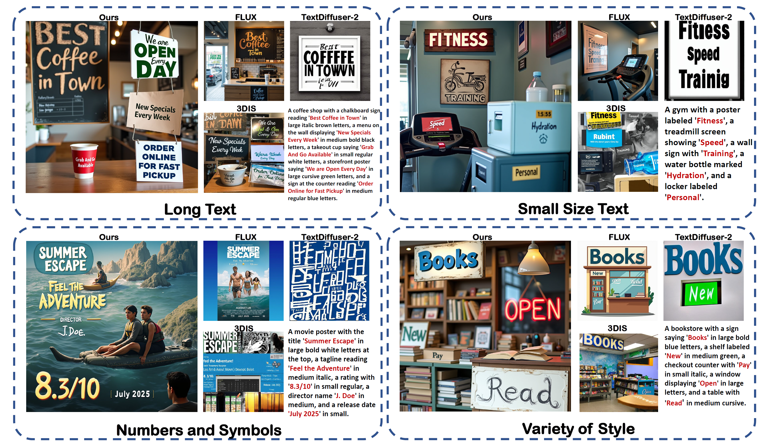 ์ด ๋ ผ๋ฌธ์ ๋ณต์กํ ์๊ฐ์ ํ ์คํธ ์์ฑ(CVTG) ์์ ์ ๋ฌธ์ ์ ์ ํด๊ฒฐํ๊ธฐ ์ํ TextCrafter๋ผ๋ ์๋ก์ด ๋ฐฉ๋ฒ์ ์๊ฐํฉ๋๋ค. ๊ธฐ์กด ์ด๋ฏธ์ง ์์ฑ ๋ชจ๋ธ๋ค์ ์๊ณก๋๊ณ ํ๋ฆฟํ ์๊ฐ์ ํ ์คํธ๋ฅผ ๋ ๋๋งํ๊ฑฐ๋ ์ผ๋ถ ํ ์คํธ๋ฅผ ๋๋ฝํ๋ ๊ฒฝํฅ์ด ์์์ต๋๋ค. TextCrafter๋ ๋ณต์กํ ์๊ฐ์ ํ ์คํธ๋ฅผ ๊ฐ๋ณ ๊ตฌ์ฑ ์์๋ก ์ ์ง์ ์ผ๋ก ๋ถํดํ๋ฉด์ ํ ์คํธ ๋ด์ฉ๊ณผ ์๊ฐ์ ๋งค์ฒด ๊ฐ์ ๊ฐ๋ ฅํ ์ ๋ ฌ์ ๋ณด์ฅํ๋ ์ ๋ต์ ์ฑํํฉ๋๋ค. ๋ํ ์์ฑ ๊ณผ์ ์์ ์๊ฐ์ ํ ์คํธ์ ์ค์์ฑ์ ์ฆํญ์ํค๋ ํ ํฐ ํฌ์ปค์ค ๊ฐํ ๋ฉ์ปค๋์ฆ์ ๋์ ํ์ฌ ํ ์คํธ ํผ๋, ๋๋ฝ, ํ๋ฆฟํจ๊ณผ ๊ฐ์ CVTG ์์ ์ ์ฃผ์ ๋ฌธ์ ๋ฅผ ํจ๊ณผ์ ์ผ๋ก ํด๊ฒฐํฉ๋๋ค. ์ฐ๊ตฌํ์ CVTG-2K๋ผ๋ ์๋ก์ด ๋ฒค์น๋งํฌ ๋ฐ์ดํฐ์ ์ ์ ์ํ์ฌ ์์ฑ ๋ชจ๋ธ์ ์ฑ๋ฅ์ ์๊ฒฉํ๊ฒ ํ๊ฐํ ์ ์๊ฒ ํ์์ผ๋ฉฐ, ๊ด๋ฒ์ํ ์คํ์ ํตํด ์ด ๋ฐฉ๋ฒ์ด ์ต์ ์ ๊ทผ๋ฒ์ ๋ฅ๊ฐํจ์ ์ ์ฆํ์์ต๋๋ค.