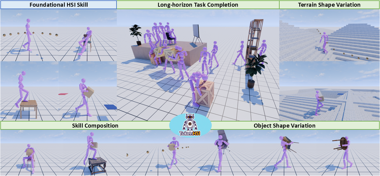 TokenHSI๋ ์์ ํ ํฐํ๋ฅผ ํตํ ๋ฌผ๋ฆฌ์ ์ธ๊ฐ-์ฅ๋ฉด ์ํธ์์ฉ(HSI)์ ํตํฉ ํฉ์ฑ ๋ฐฉ๋ฒ์ ์ ์ํฉ๋๋ค. ๋ค์ํ๊ณ ๋ฌผ๋ฆฌ์ ์ผ๋ก ํ๋นํ HSI ํฉ์ฑ์ ์ปดํจํฐ ์ ๋๋ฉ์ด์ ๊ณผ ์ฒดํ๋ AI ๋ชจ๋์๊ฒ ์ค์ํฉ๋๋ค. ํ์ฌ์ ๋ฐฉ๋ฒ๋ค์ ์ฃผ๋ก ํน์ ์ํธ์์ฉ ์์ ์ ํนํ๋ ๋ณ๋์ ์ปจํธ๋กค๋ฌ ๊ฐ๋ฐ์ ์ค์ ์ ๋๊ณ ์์ด, ๋ฌผ๊ฑด์ ๋ค๊ณ ์๋ ๊ฒ๊ณผ ๊ฐ์ด ์ฌ๋ฌ ๊ธฐ์ ์ ํตํฉ์ด ํ์ํ ๋ค์ํ ๋์ ์ HSI ์์ ์ ๋ค๋ฃจ๋ ๋ฅ๋ ฅ์ ํฌ๊ฒ ์ ํํฉ๋๋ค. ์ด ๋ฌธ์ ๋ฅผ ํด๊ฒฐํ๊ธฐ ์ํด TokenHSI๋ ๋ค์ค ๊ธฐ์ ํตํฉ๊ณผ ์ ์ฐํ ์ ์์ ๊ฐ๋ฅํ๊ฒ ํ๋ ๋จ์ผ, ํตํฉ ํธ๋์คํฌ๋จธ ๊ธฐ๋ฐ ์ ์ฑ ์ ์ ์ํฉ๋๋ค. ํต์ฌ ์์ด๋์ด๋ ํด๋จธ๋ ธ์ด๋ ๊ณ ์ ์์ฉ์ ๋ณ๋์ ๊ณต์ ํ ํฐ์ผ๋ก ๋ชจ๋ธ๋งํ๊ณ ๋ง์คํน ๋ฉ์ปค๋์ฆ์ ํตํด ๊ณ ์ ํ ์์ ํ ํฐ๊ณผ ๊ฒฐํฉํ๋ ๊ฒ์ ๋๋ค. ์ด๋ฌํ ํตํฉ ์ ์ฑ ์ ๊ธฐ์ ๊ฐ์ ํจ๊ณผ์ ์ธ ์ง์ ๊ณต์ ๋ฅผ ๊ฐ๋ฅํ๊ฒ ํ์ฌ ๋ค์ค ์์ ํ๋ จ์ ์ด์งํฉ๋๋ค. ์คํ ๊ฒฐ๊ณผ ์ด ์ ๊ทผ๋ฒ์ด ๋ค์ํ HSI ์์ ์์ ๋ค์์ฑ, ์ ์์ฑ, ํ์ฅ์ฑ์ ํฌ๊ฒ ํฅ์์ํฌ ์ ์์์ ๋ณด์ฌ์ค๋๋ค.