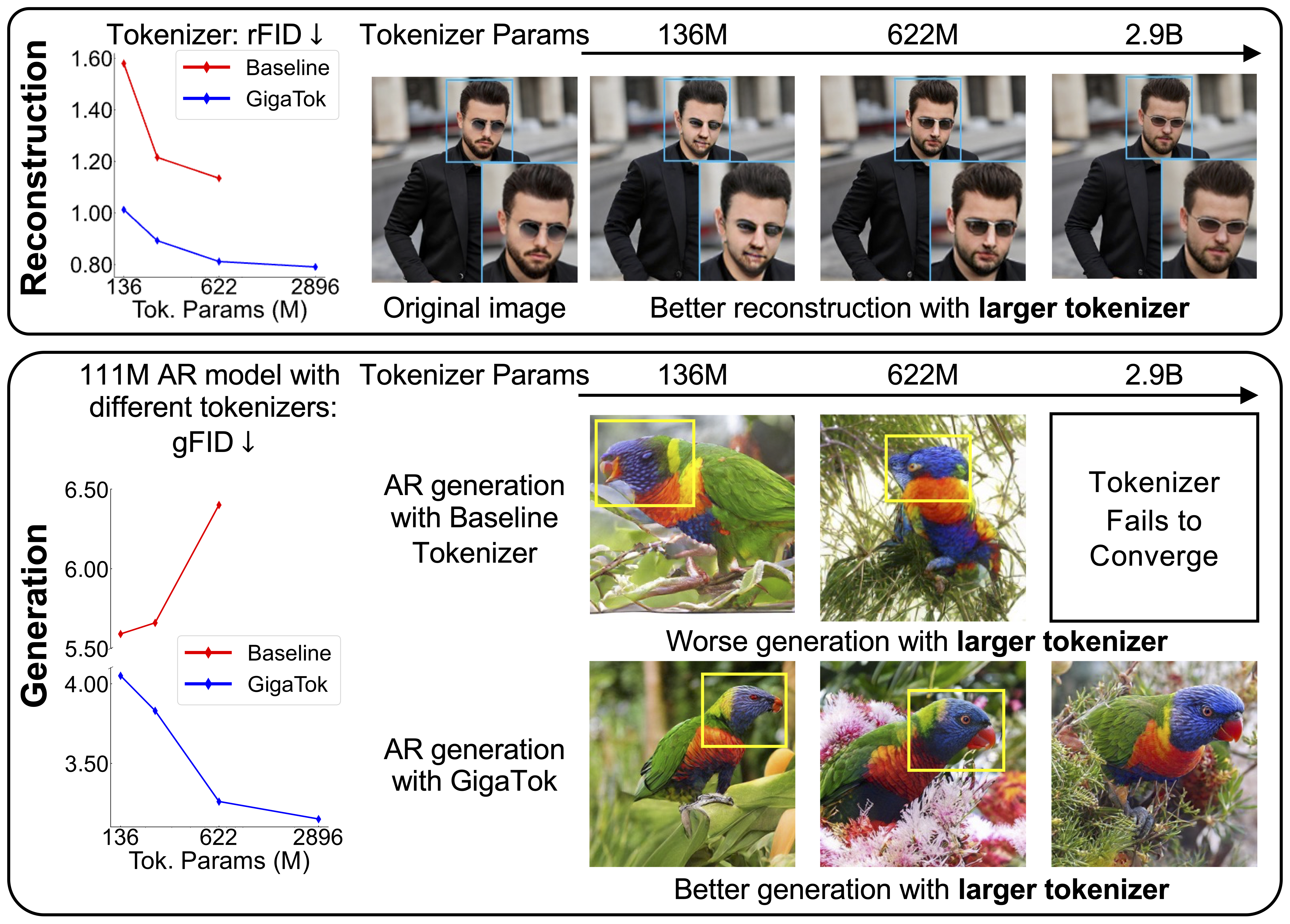 ์๊ธฐํ๊ท ์ด๋ฏธ์ง ์์ฑ ์ ์๊ฐ ํ ํฌ๋์ด์ ๋ฅผ ํ์ฅํ๋ฉด ๋ณต์ ํ์ง์ ์ข์์ง์ง๋ง ์์ฑ ํ์ง์ ๋๋น ์ง๋ ๋๋ ๋ง๋ฅผ ํด๊ฒฐํ๊ธฐ ์ํด 'GigaTok' ์ ๊ทผ๋ฒ์ด ๊ฐ๋ฐ๋์์ต๋๋ค. GigaTok์ ์ ์ฌ ๊ณต๊ฐ ๋ณต์ก์ฑ ์ฆ๊ฐ๋ฅผ ๋ฌธ์ ์ ์์ธ์ผ๋ก ๋ณด๊ณ , ํ ํฌ๋์ด์ ํน์ง์ ์ฌ์ ํ๋ จ๋ ์ธ์ฝ๋ ํน์ง๊ณผ ์ ๋ ฌ์ํค๋ '์๋ฏธ๋ก ์ ์ ๊ทํ'๋ฅผ ์ ์ํ์ฌ ์ด ๋ฌธ์ ๋ฅผ ์ํํ์ผ๋ฉฐ, 1D ํ ํฌ๋์ด์ ์ฌ์ฉ ๋ฑ ํจ์จ์ ์ธ ํ์ฅ ๊ธฐ๋ฒ์ ํตํด 30์ต ํ๋ผ๋ฏธํฐ ๊ท๋ชจ์์ ๋ณต์, ์์ฑ, ํํ ํ์ต ๋ชจ๋์์ ์ต์ฒจ๋จ ์ฑ๋ฅ์ ๋ฌ์ฑํ์ต๋๋ค.