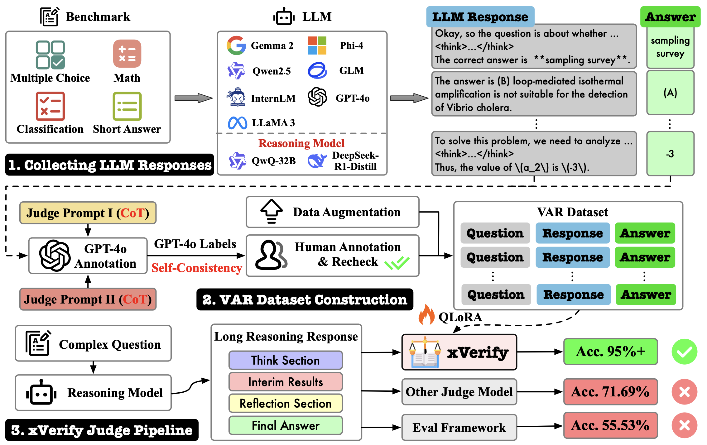 ๋ณต์กํ ์ถ๋ก ๊ณผ์ ์ ํฌํจํ๋ ์ต์ LLM์ ๋ต๋ณ์ ์ ํํ ํ๊ฐํ๊ธฐ ์ด๋ ค์ด ๋ฌธ์ ๋ฅผ ํด๊ฒฐํ๊ธฐ ์ํด, 'xVerify'๋ผ๋ ํจ์จ์ ์ธ ๋ต๋ณ ๊ฒ์ฆ๊ธฐ๊ฐ ๊ฐ๋ฐ๋์์ต๋๋ค. ์ด ๊ฒ์ฆ๊ธฐ๋ ๋ชจ๋ธ์ ์ถ๋ ฅ๊ณผ ์ฐธ์กฐ ๋ต์ ์ฌ์ด์ ์๋ฏธ๋ก ์ ๋ฑ๊ฐ์ฑ์ ํจ๊ณผ์ ์ผ๋ก ํ๋จํ๋ฉฐ, ์ด๋ฅผ ์ํด ๋ค์ํ LLM๊ณผ ๋ฐ์ดํฐ์ ์ผ๋ก ๊ตฌ์ถ๋ VAR ๋ฐ์ดํฐ์ ์์ ํ๋ จ๋์์ต๋๋ค. ํ๊ฐ ๊ฒฐ๊ณผ, xVerify๋ 95% ์ด์์ ๋์ ์ ํ๋๋ฅผ ๋ณด์๊ณ , ์ผ๋ถ ๋ชจ๋ธ์ GPT-4o๋ณด๋ค๋ ์ฐ์ํ ์ฑ๋ฅ์ ๋ํ๋ด๋ฉฐ ๊ทธ ํจ๊ณผ์ฑ๊ณผ ์ผ๋ฐํ ๊ฐ๋ฅ์ฑ์ ์ ์ฆํ์ต๋๋ค.