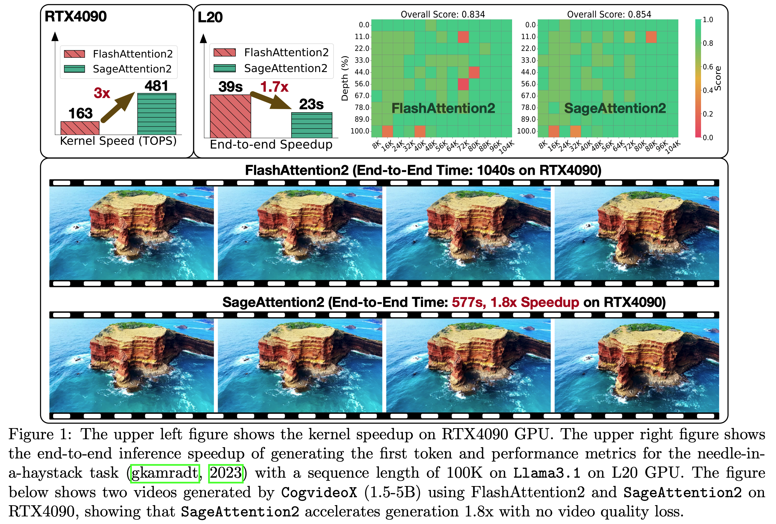 ์ด ์ฐ๊ตฌ๋ ์ดํ ์ ์ ํจ์จ์ฑ์ ๋์ด๊ธฐ ์ํ ๋ ๊ฐ์ง ํต์ฌ ๊ธฐ์ฌ๋ฅผ ์ ์ํ๋ค. ์ฒซ์งธ, Blackwell GPU์ ์๋ก์ด FP4 Tensor Cores๋ฅผ ํ์ฉํ์ฌ ์ดํ ์ ๊ณ์ฐ์ ๊ฐ์ํํ๋ฉฐ, ์ด๋ RTX5090์์ ๊ฐ์ฅ ๋น ๋ฅธ FlashAttention๋ณด๋ค 5๋ฐฐ ๋น ๋ฅธ ์๋๋ฅผ ๋ณด์ฌ์ค๋ค. ์ด FP4 ์ดํ ์ ์ ๋ค์ํ ๋ชจ๋ธ์ ์ถ๋ก ์ ํ๋ฌ๊ทธ ์ค ํ๋ ์ด ๋ฐฉ์์ผ๋ก ์ ์ฉ๋ ์ ์๋ค. ๋์งธ, ์ ๋นํธ ์ดํ ์ (low-bit attention)์ ํ์ต ์์ ์ ์ ์ฉํ๋ ์ ๊ตฌ์ ์ธ ์๋๋ฅผ ํ๋ค. ๊ธฐ์กด ์ฐ๊ตฌ๋ค์ด ์ถ๋ก ์๋ง ์ด์ ์ ๋ง์ท๋ ๊ฒ๊ณผ ๋ฌ๋ฆฌ, ์๋ฐฉํฅ ๋ฐ ์ญ๋ฐฉํฅ ์ ํ ๋ชจ๋๋ฅผ ์ํ ์ ํํ๊ณ ํจ์จ์ ์ธ 8๋นํธ ์ดํ ์ ์ ์ค๊ณํ๋ค. ์คํ ๊ฒฐ๊ณผ, 8๋นํธ ์ดํ ์ ์ ๋ฏธ์ธ ์กฐ์ ์์ ์์ ๋ฌด์์ค ์ฑ๋ฅ์ ๋ฌ์ฑํ์ง๋ง, ์ฌ์ ํ์ต ์์ ์์๋ ์๋ ด ์๋๊ฐ ๋๋ ค์ง๋ ๊ฒฝํฅ์ ๋ณด์๋ค.