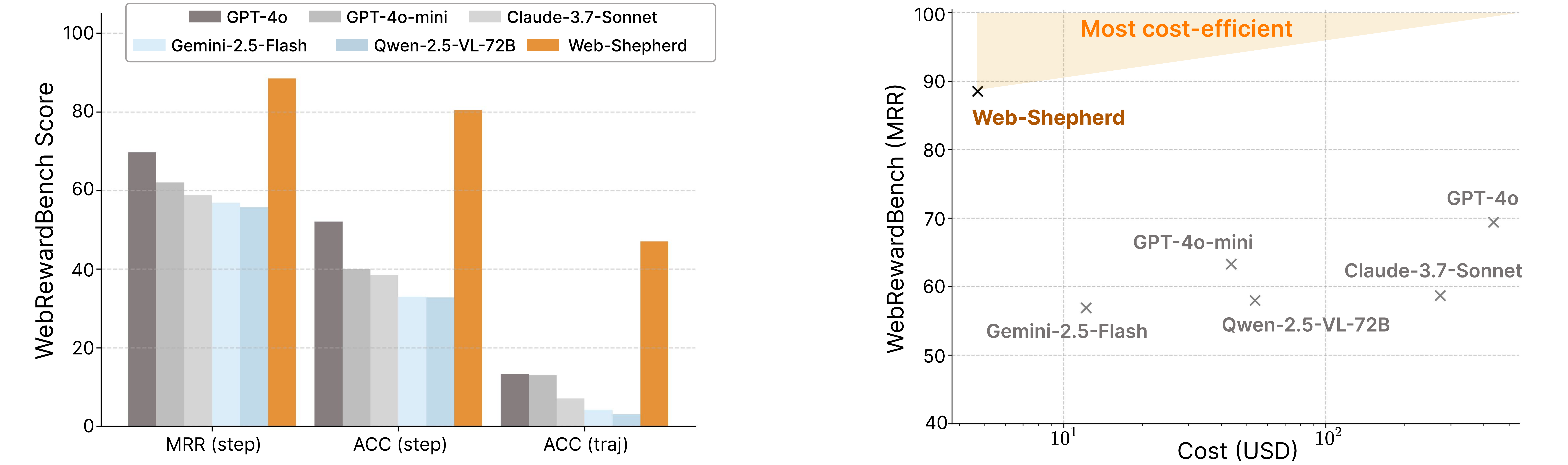 ์ด ์ฐ๊ตฌ๋ ์น ๋ด๋น๊ฒ์ด์ ์ ํนํ๋ ์ต์ด์ ํ๋ก์ธ์ค ๋ณด์ ๋ชจ๋ธ(PRM)์ธ Web-Shepherd๋ฅผ ์ ์ํ๋ค. ์น ๋ด๋น๊ฒ์ด์ ์ ๋ณต์กํ ๋ค๋จ๊ณ ์์ฌ ๊ฒฐ์ ์ด ํ์ํ ๋์ ์ ์ธ ์์ญ์ด๋ฉฐ, Web-Shepherd๋ ๋จ๊ณ๋ณ๋ก ์น ๋ด๋น๊ฒ์ด์ ๊ฒฝ๋ก๋ฅผ ํ๊ฐํ ์ ์๋ค. ์ด ๋ชจ๋ธ์ ์ํด 4๋ง ๊ฐ์ ๋จ๊ณ๋ณ ์ ํธ๋ ์์ผ๋ก ๊ตฌ์ฑ๋ ๋๊ท๋ชจ ๋ฐ์ดํฐ์ ์ธ WebPRM Collection์ ๊ตฌ์ถํ์ผ๋ฉฐ, PRM ํ๊ฐ๋ฅผ ์ํ ์ต์ด์ ๋ฉํ ํ๊ฐ ๋ฒค์น๋งํฌ์ธ WebRewardBench๋ ๋์ ํ๋ค. ์คํ ๊ฒฐ๊ณผ, Web-Shepherd๋ WebRewardBench์์ GPT-4o๋ณด๋ค ์ฝ 30% ๋ ๋์ ์ ํ๋๋ฅผ ๋ฌ์ฑํ์ผ๋ฉฐ, GPT-4o-mini๋ฅผ ์ ์ฑ ์ผ๋ก ์ฌ์ฉํ๊ณ Web-Shepherd๋ฅผ ๊ฒ์ฆ์๋ก ์ฌ์ฉํ์ ๋ ๋ ์ ์ ๋น์ฉ์ผ๋ก๋ ๋ ๋์ ์ฑ๋ฅ์ ๋ณด์ฌ์ฃผ๋ฉฐ ์น ์์ด์ ํธ์ ์ค์ ๋ฐฐํฌ ๊ฐ๋ฅ์ฑ์ ๋์ธ๋ค.