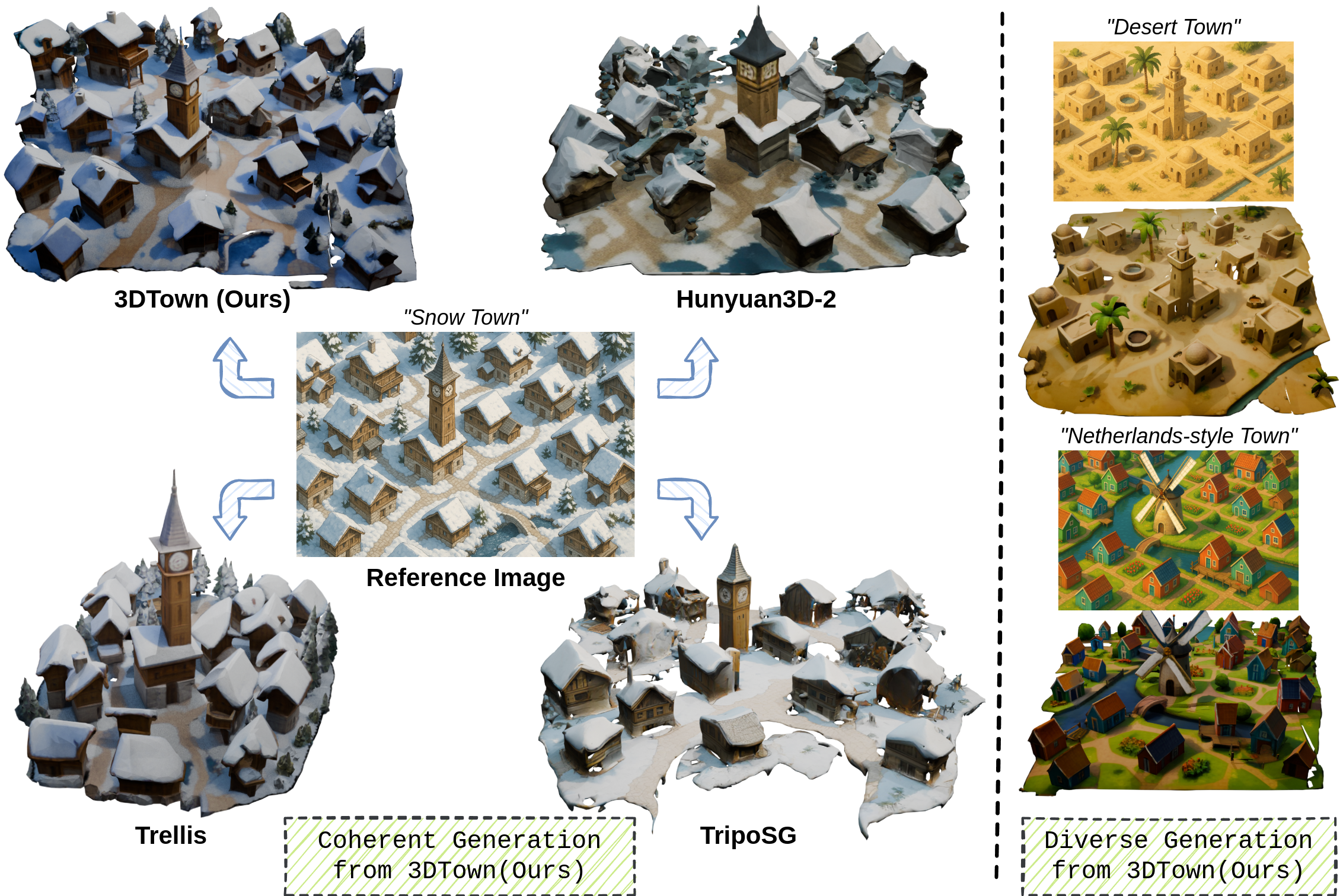 ์ด ์ฐ๊ตฌ๋ ๋จ์ผ ์๋จ ์ด๋ฏธ์ง์์ ์ฌ์ค์ ์ด๊ณ ์ผ๊ด๋ 3D ์ฅ๋ฉด์ ํฉ์ฑํ๋ ํ๋ จ ์๋(training-free) ํ๋ ์์ํฌ์ธ 3DTown์ ์๊ฐํ๋ค. ์์ธํ 3D ์ฅ๋ฉด ํ๋์ด ์ผ๋ฐ์ ์ผ๋ก ๋์ ๋น์ฉ๊ณผ ๋ณต์กํ ๊ณผ์ ์ ์๊ตฌํ๋ ๋ฌธ์ ๋ฅผ ํด๊ฒฐํ๊ธฐ ์ํด, 3DTown์ ์ด๋ฏธ์ง-3D ์ ๋ ฌ ๋ฐ ํด์๋ ๊ฐ์ ์ ์ํ ์์ญ ๊ธฐ๋ฐ ์์ฑ๊ณผ ์ ์ญ ์ฅ๋ฉด ์ผ๊ด์ฑ ๋ฐ ๊ณ ํ์ง ๊ธฐํํ ์์ฑ์ ๋ณด์ฅํ๋ ๊ณต๊ฐ ์ธ์ 3D ์ธํ์ธํ ์ด๋ผ๋ ๋ ๊ฐ์ง ์์น์ ๊ธฐ๋ฐํ๋ค. ์ด ๋ฐฉ๋ฒ์ ์ ๋ ฅ ์ด๋ฏธ์ง๋ฅผ ์ค์ฒฉ๋ ์์ญ์ผ๋ก ๋ถํดํ๊ณ ๊ฐ ์์ญ์ ์ฌ์ ํ์ต๋ 3D ๊ฐ์ฒด ์์ฑ๊ธฐ๋ก ์์ฑํ ๋ค์, ๋ง์คํฌ๋ ์ ๋ฅ ์ ๋(rectified flow) ์ธํ์ธํ ํ๋ก์ธ์ค๋ฅผ ํตํด ๋๋ฝ๋ ๊ธฐํํ์ ์ฑ์ด๋ค. ์ด ๋ชจ๋์ ์ค๊ณ๋ 3D ๊ฐ๋ ์ด๋ ๋ฏธ์ธ ์กฐ์ ์์ด๋ ํด์๋ ๋ณ๋ชฉ ํ์์ ๊ทน๋ณตํ๊ณ ๊ณต๊ฐ ๊ตฌ์กฐ๋ฅผ ๋ณด์กดํ ์ ์๊ฒ ํ๋ฉฐ, ๊ธฐ์กด ์ต์ ๋ชจ๋ธ๋ค์ ๋ฅ๊ฐํ๋ ๊ณ ํ์ง 3D ๋์ ์์ฑ์ ๊ฐ๋ฅํ๊ฒ ํ๋ค.
